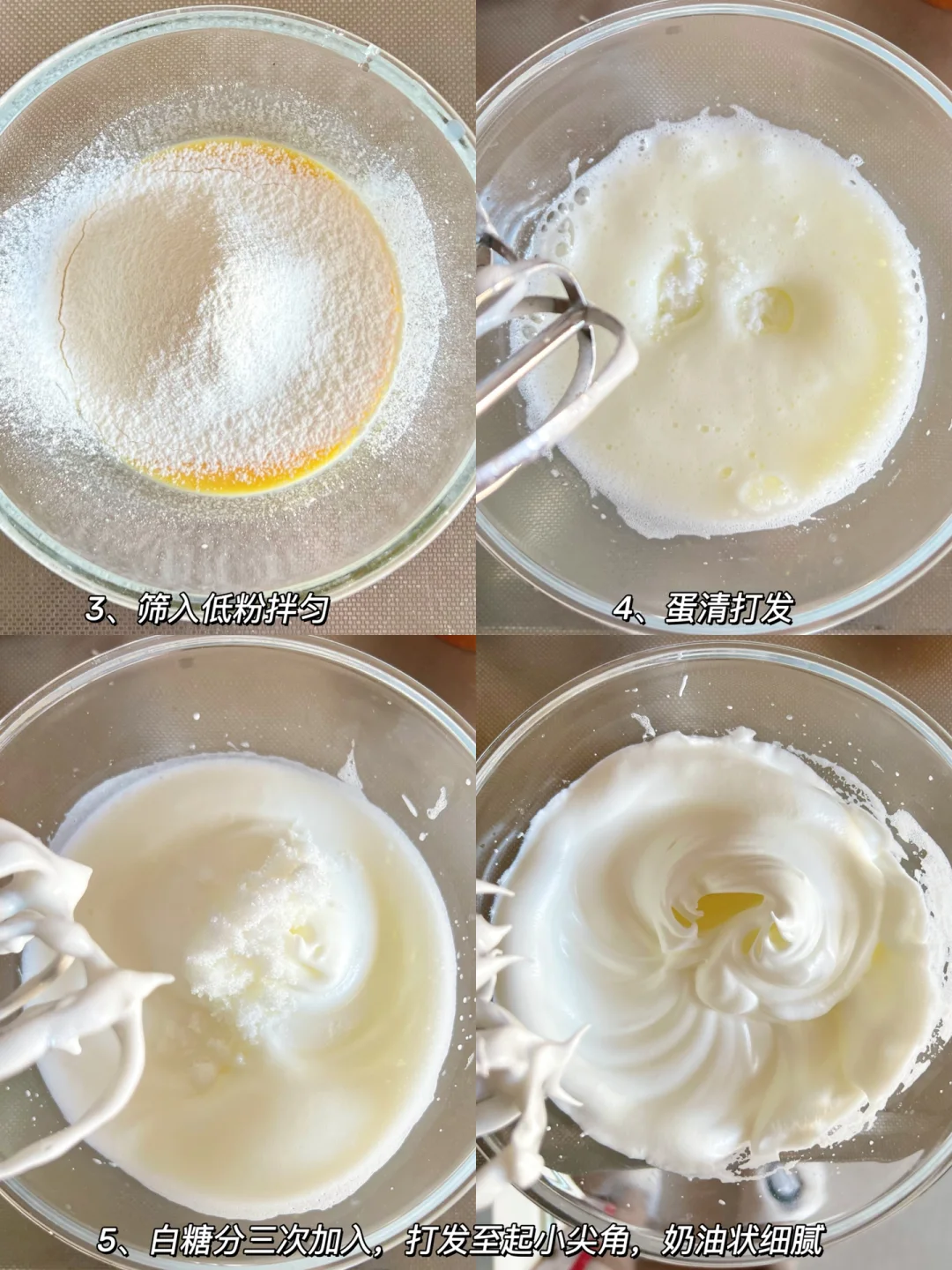 1、蛋清蛋黄分离,蛋黄加入奶搅拌均匀,筛入低筋面粉Z型拌匀