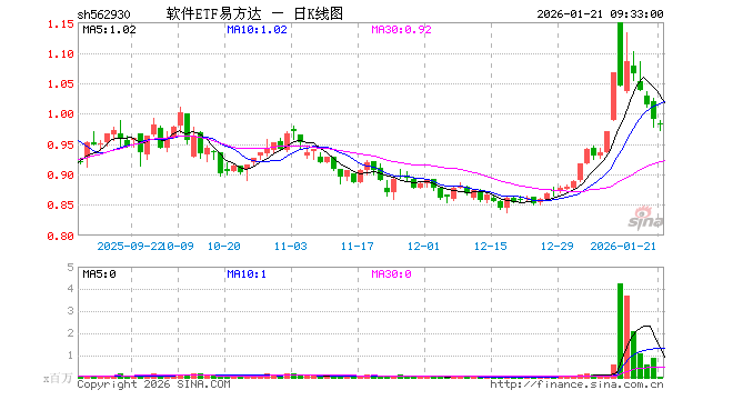 1月21日,软件ETF易方达(562930)开盘跌0.61%,报0.984元。软件ETF易方达(562930)重仓股方面,科大讯飞开盘跌1.02%,同花顺涨1.44%,金山办公跌0.30%,指南针跌0.35%,恒生电子跌0.62%,润和软件跌0.83%,三六零跌0.81%,拓维信息跌0.78%,用友网络跌0.99%。