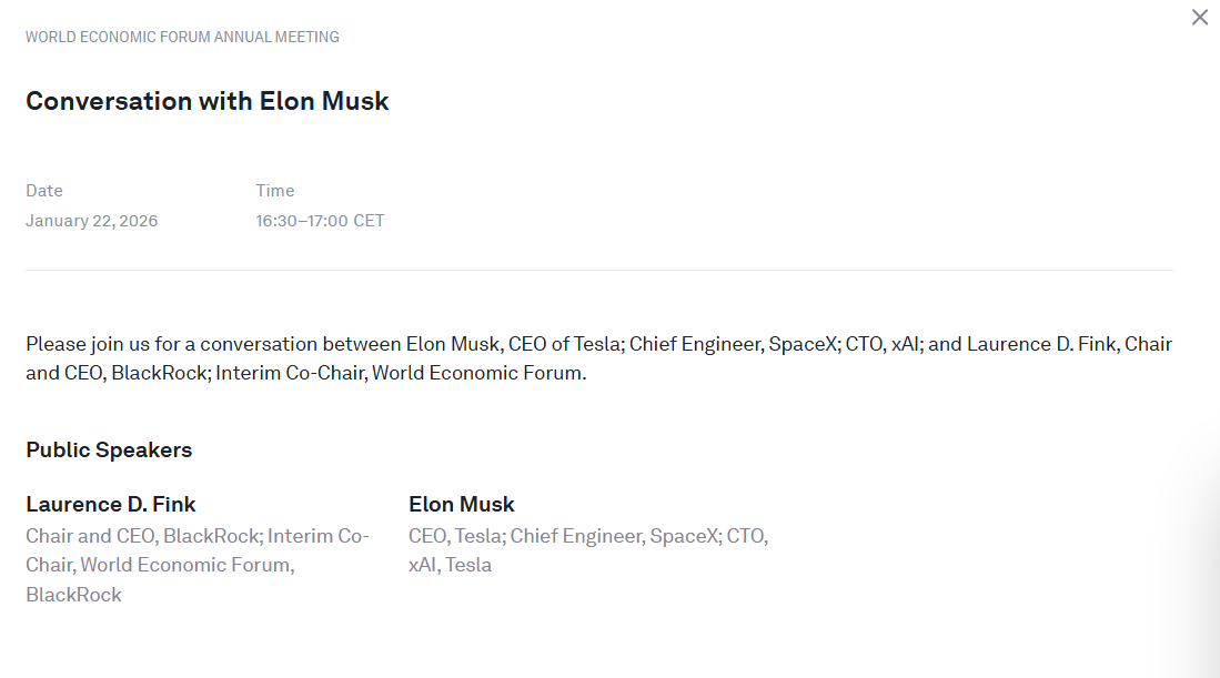 根据达沃斯官方披露的消息,马斯克将于瑞士时间周四下午4点30分(北京时间周四晚间11点30分)与贝莱德集团首席执行官拉里·芬克一同出席一场会议。
