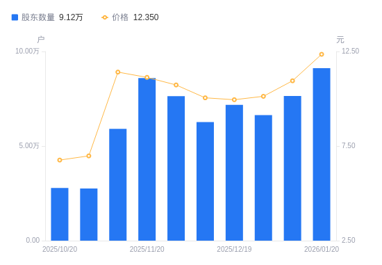 日期A股户数(户)流通A股户均持股数(股)户均持股市值(万元)2026-01-20911974815.395.952026-01-09765085739.916.292025-12-31664006613.696.702025-12-19718296113.816.082025-12-10626557009.007.042025-11-28763545751.496.172025-11-20859135111.555.692025-11-10591437425.218.472025-10-312753415949.3411.132025-10-202787615753.6610.65