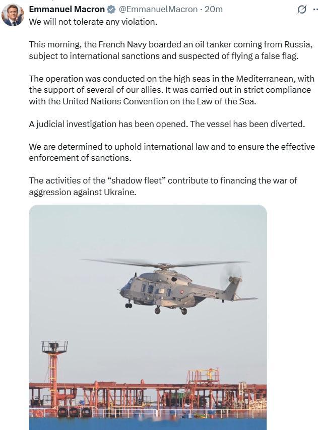 法国在地中海海域扣押了一艘俄罗斯油轮——马克龙宣布“今天早上,法国海军登上了一艘