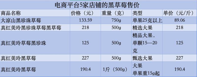 电商平台五家店铺的黑草莓售价。图/新京报记者刘欢制图