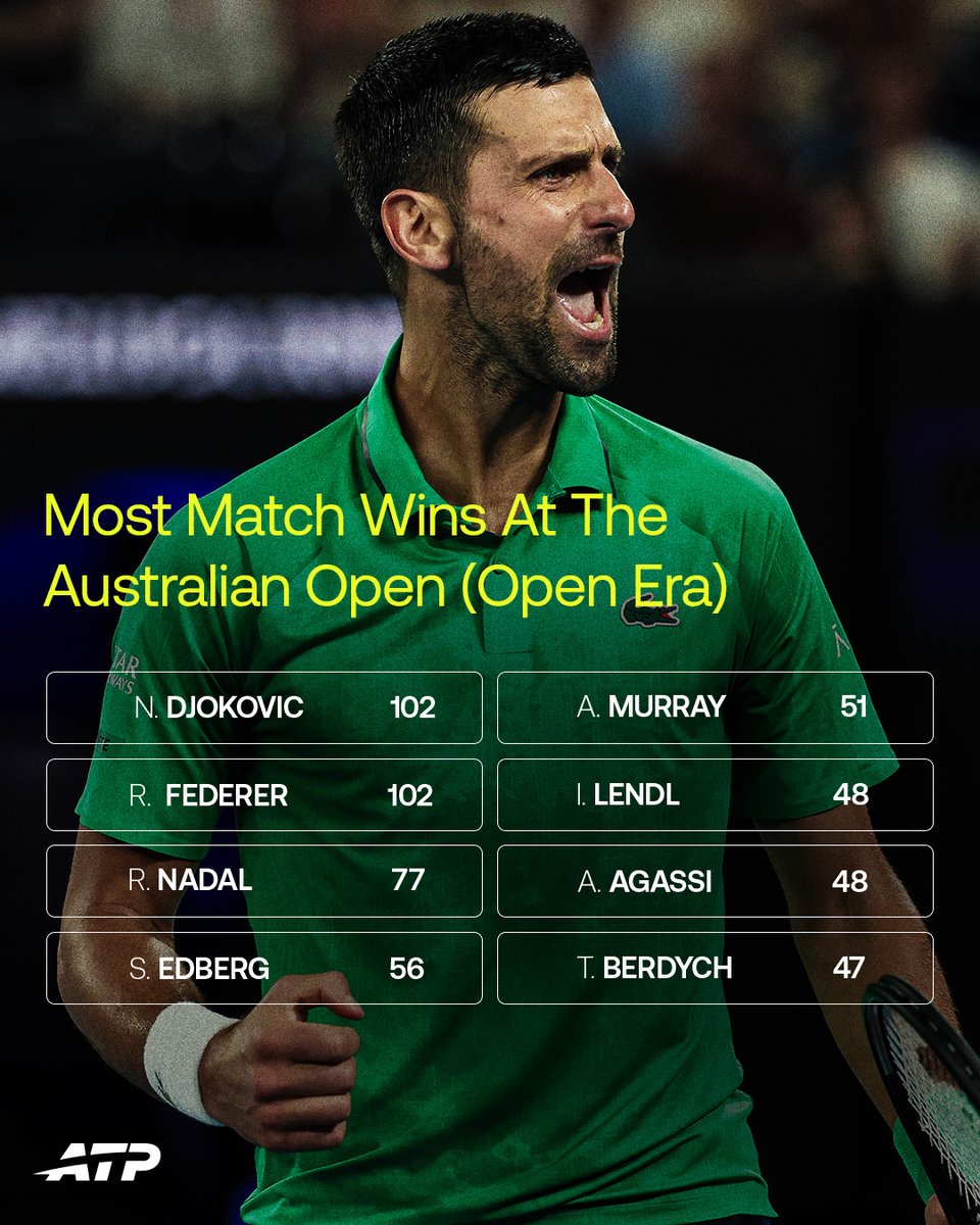 ATPTour(网球)报道。诺瓦克·德约科维奇在澳大利亚网球公开赛中获得第102场胜利,追平了罗杰·费德勒的历史纪录。#AO26