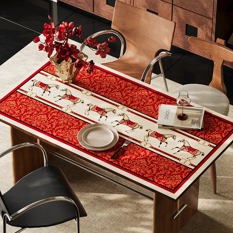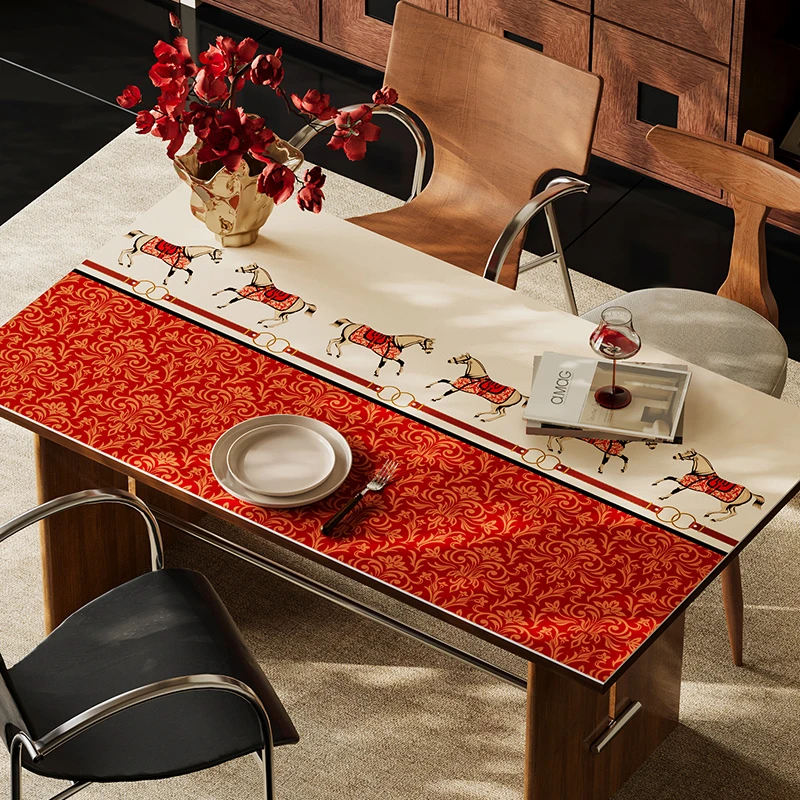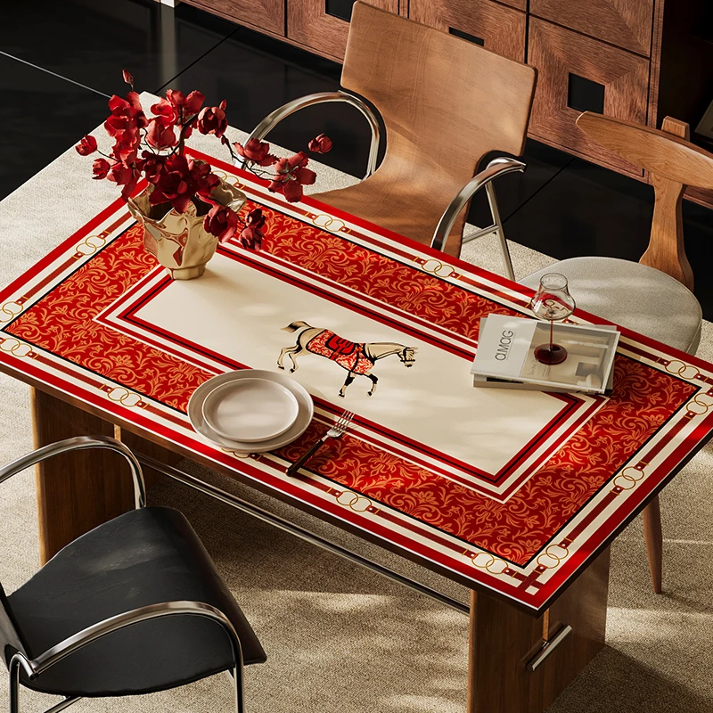 正红色底纹配金色缠枝纹,中间刺绣的骏马🐎踩着祥云,寓意“马到成功”,边缘的金属环设计自带贵气感~ 铺上桌瞬间年味拉满,暖光灯下像撒了一层金粉✨,拍照发圈被问爆链接!
