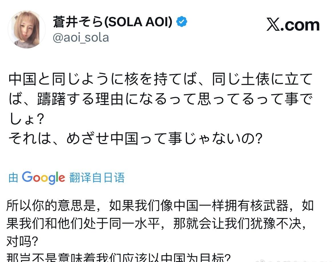 苍老师因为中日关系,在社交媒体上大战日本右翼分子,日本右翼分子鼓吹日本应该发展核