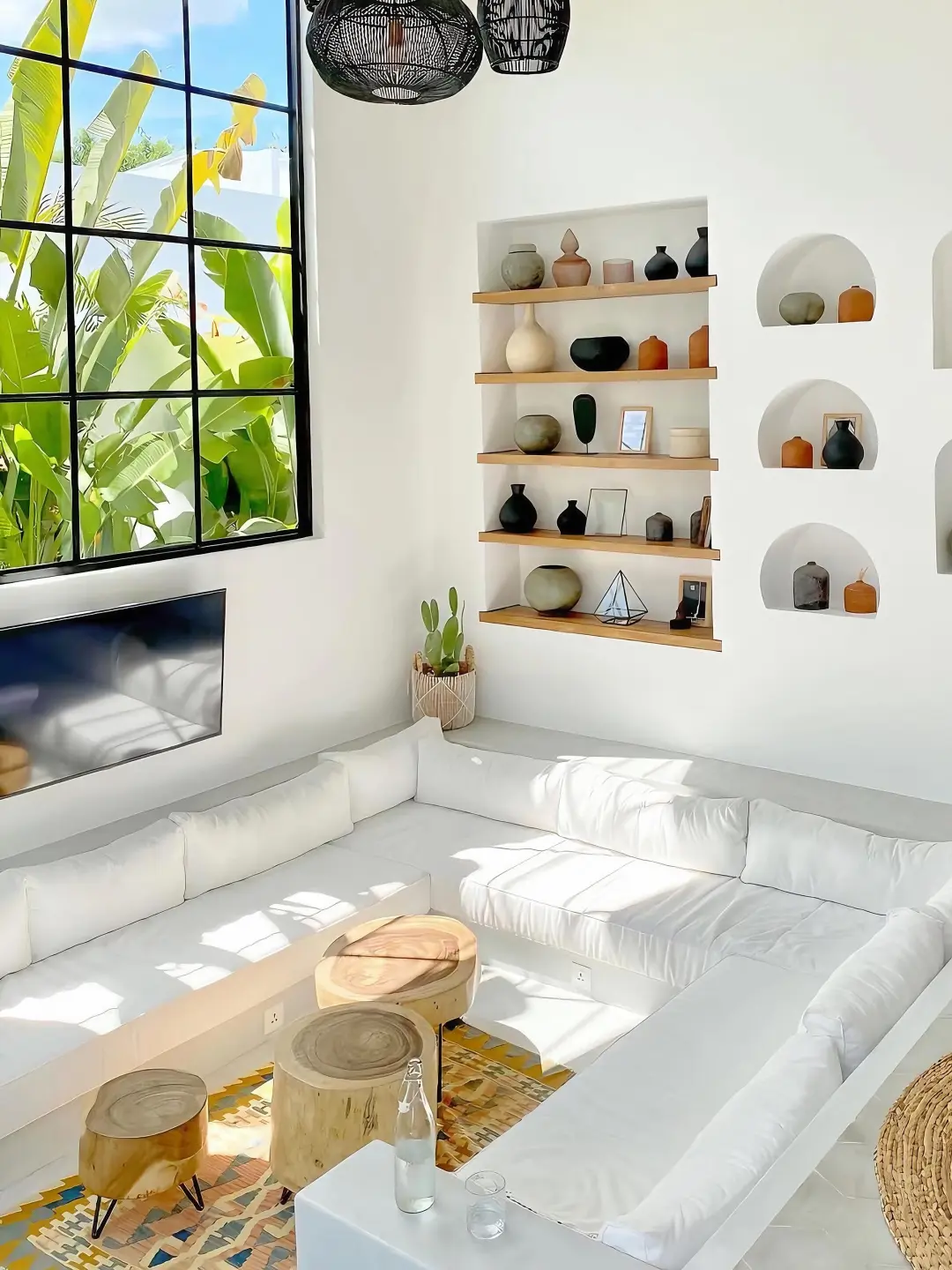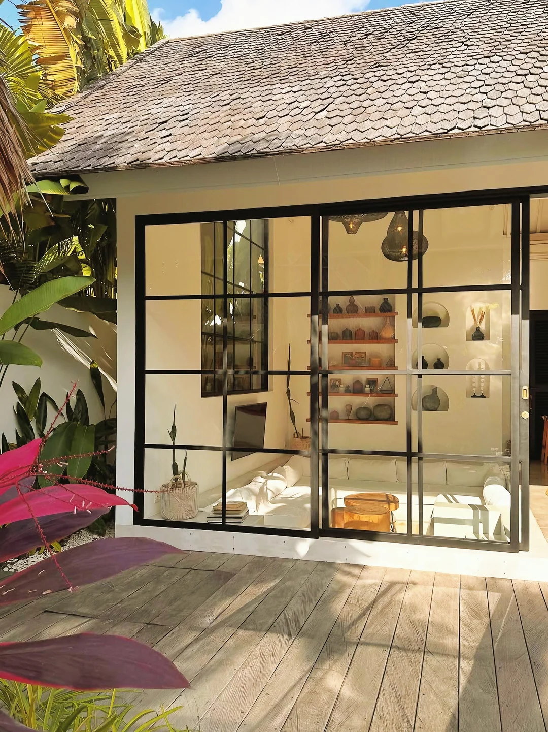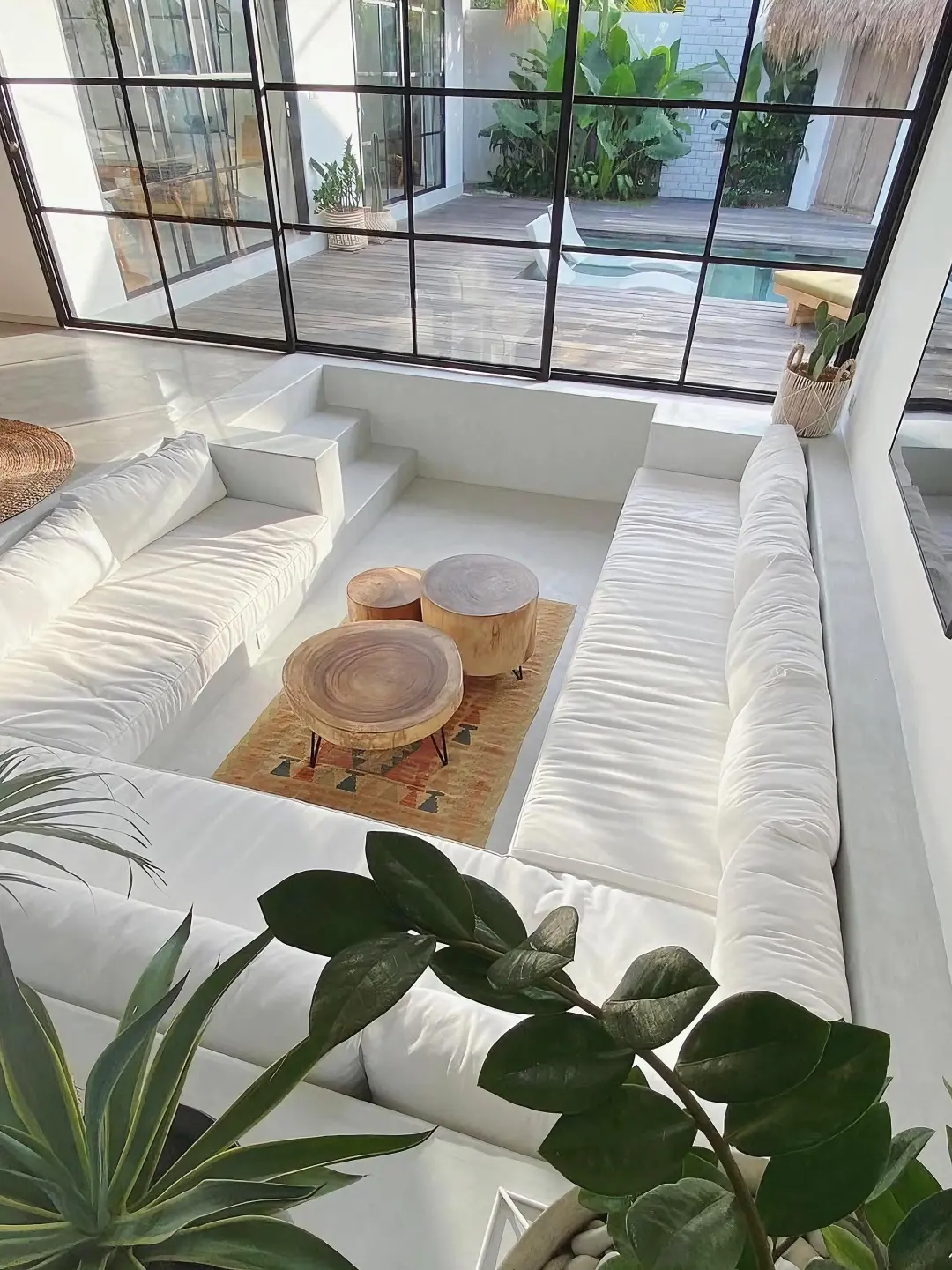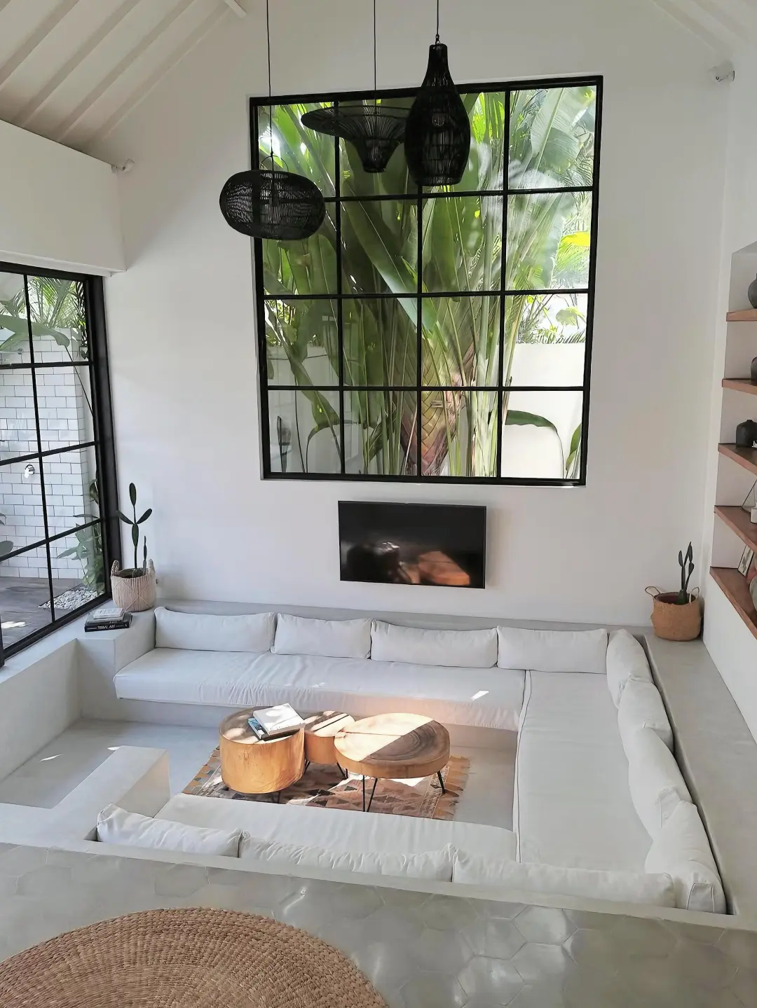 别墅设计的超级美,最大的亮点莫过于明亮的落地玻璃窗,四周芭蕉叶环绕,配有下沉式的客厅,黑框滑动玻璃门可欣赏热带香蕉种植园的美景,显得整个空间设计感和高级感满满