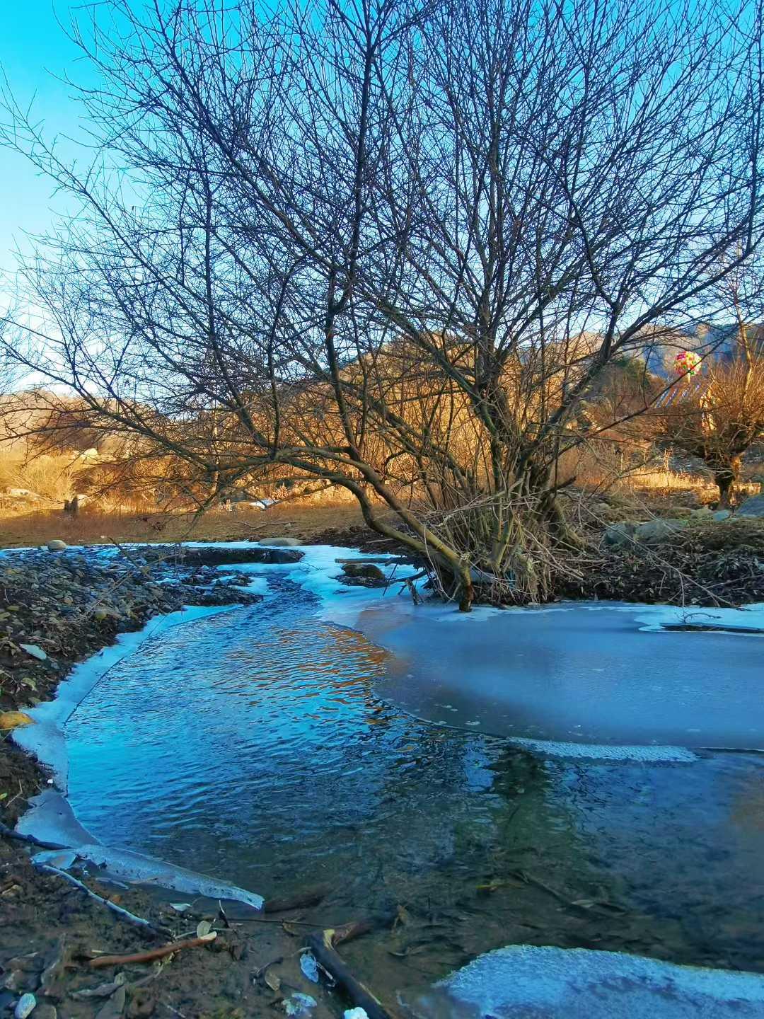夏见苍翠,今遇霜雪。人迹寥寥,静听冰下流水潺潺,漫闻草间牛啃青欢,冬景自有清欢之美。