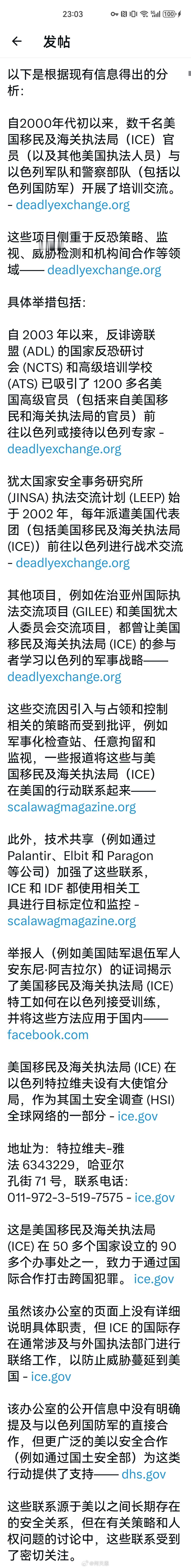 说出来你可能不信多份报告显示,ICE由以色列国防军(IDF) 和其他以色列安全机构进行训练。是的,美国移民和海关执法局(ICE)曾参与以色列国防军(IDF)和其他以色列安全机构的培训项目,并在以色列设有办事处。以下是根据现有信息得出的分析:图一何天恩美国ICE行刑式处决海外新鲜事