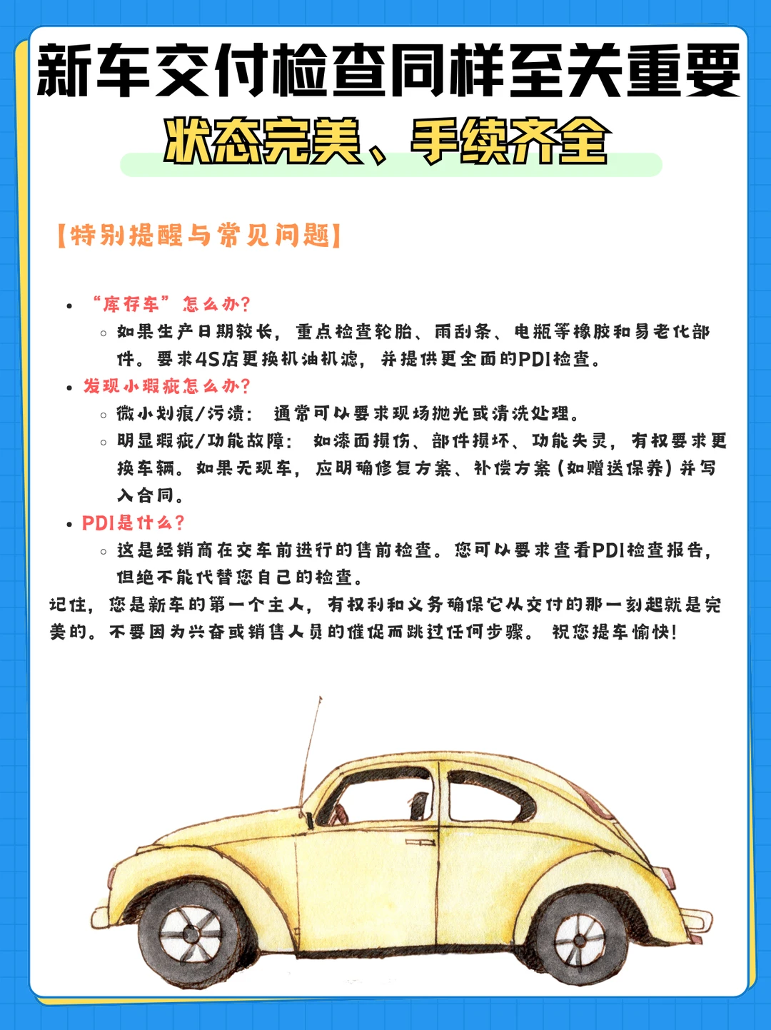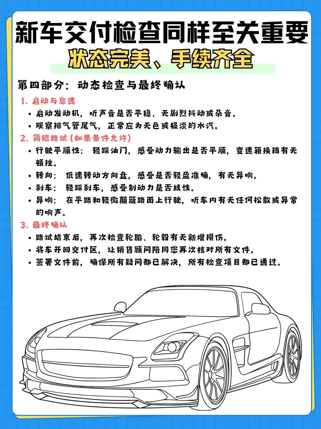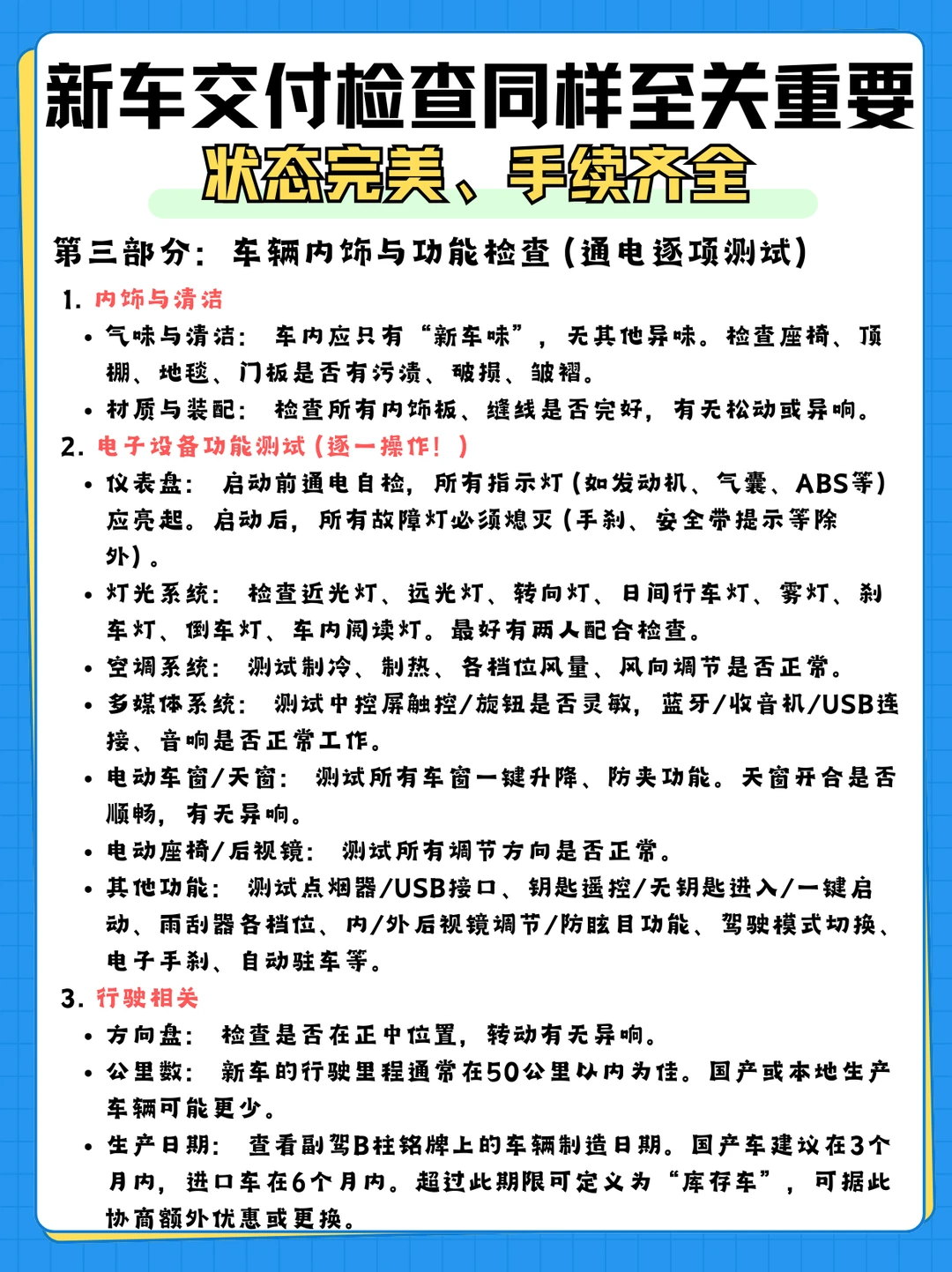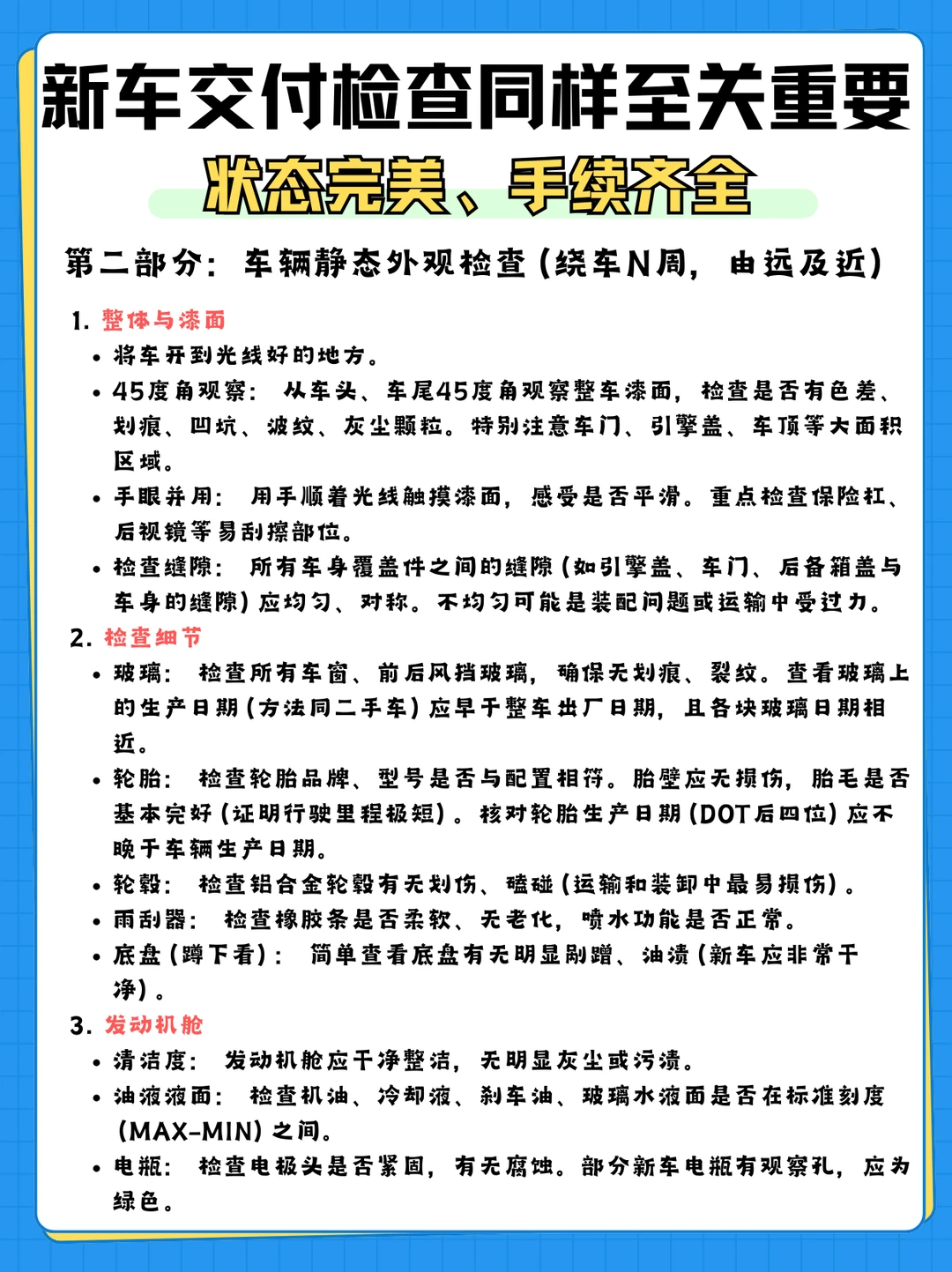 车辆静态外观检查(绕车N周,由远及近) 1. 整体与漆面 将车开到光线好的地方。 45度角观察:​ 从车头、车尾45度角观察整车漆面,检查是否有色差、划痕、凹坑、波纹、灰尘颗粒。特别注意车门、引擎盖、车顶等大面积区域。 手眼并用:​ 用手顺着光线触摸漆面,感受是否平滑。重点检查保险杠、后视镜等易刮擦部位。 检查缝隙:​ 所有车身覆盖件之间的缝隙(如引擎盖、车门、后备箱盖与车身的缝隙)应均匀、对称。不均匀可能是装配问题或运输中受过力。 2. 检查细节 玻璃:​ 检查所有车窗、前后风挡玻璃,确保无划痕、裂纹。查看玻璃上的生产日期(方法同二手车)应早于整车出厂日期,且各块玻璃日期相近。 轮胎:​ 检查轮胎品牌、型号是否与配置相符。胎壁应无损伤,胎毛是否基本完好(证明行驶里程极短)。核对轮胎生产日期(DOT后四位)应不晚于车辆生产日期。 轮毂:​ 检查铝合金轮毂有无划伤、磕碰(运输和装卸中最易损伤)。 雨刮器:​ 检查橡胶条是否柔软、无老化,喷水功能是否正常。 底盘(蹲下看):​ 简单查看底盘有无明显剐蹭、油渍(新车应非常干净)。 3. 发动机舱 清洁度:​ 发动机舱应干净整洁,无明显灰尘或污渍。 油液液面:​ 检查机油、冷却液、刹车油、玻璃水液面是否在标准刻度(MAX-MIN)之间。 电瓶:​ 检查电极头是否紧固,有无腐蚀。部分新车电瓶有观察孔,应为绿色。 第三部分:车辆内饰与功能检查(通电逐项测试) 1. 内饰与清洁 气味与清洁:​ 车内应只有“新车味”,无其他异味。检查座椅、顶棚、地毯、门板是否有污渍、破损、皱褶。 材质与装配:​ 检查所有内饰板、缝线是否完好,有无松动或异响。 2. 电子设备功能测试(逐一操作!) 仪表盘:​ 启动前通电自检,所有指示灯(如发动机、气囊、ABS等)应亮起。启动后,所有故障灯必须熄灭(手刹、安全带提示等除外)。 灯光系统:​ 检查近光灯、远光灯、转向灯、日间行车灯、雾灯、刹车灯、倒车灯、车内阅读灯。最好有两人配合检查。 空调系统:​ 测试制冷、制热、各档位风量、风向调节是否正常。 记住,您是新车的第一个主人,有权利和义务确保它从交付的那一刻起就是完美的。不要因为兴奋或销售人员的催促而跳过任何步骤。​ 祝您提车愉快!