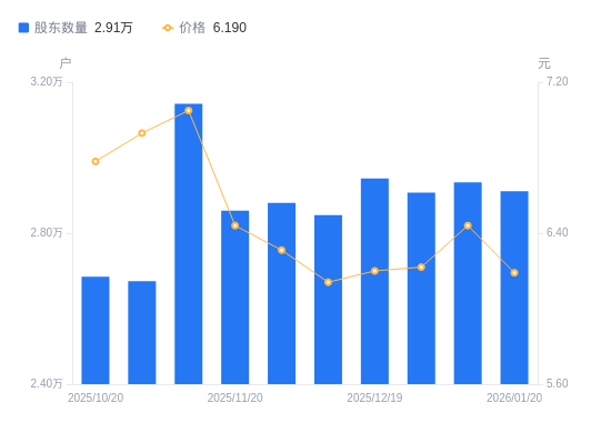 近一年(2025年1月20日至2026年1月20日),新筑股份A股股东户数从3.39万户,减低至2.91万户,降幅14.25%,区间股价上涨17.90%。