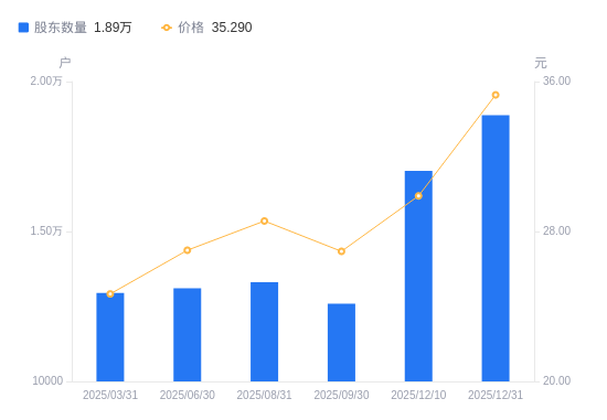 日期A股户数(户)流通A股户均持股数(股)户均持股市值(万元)2025-12-31188816317.8222.302025-12-10170247006.9720.952025-09-30125909474.7225.522025-08-31133108962.1825.602025-06-30131069101.6824.572025-03-31129477067.0617.432024-12-31121147553.0218.872024-09-30111958173.0517.532024-06-30154345928.2912.752024-03-3186318081.8813.50