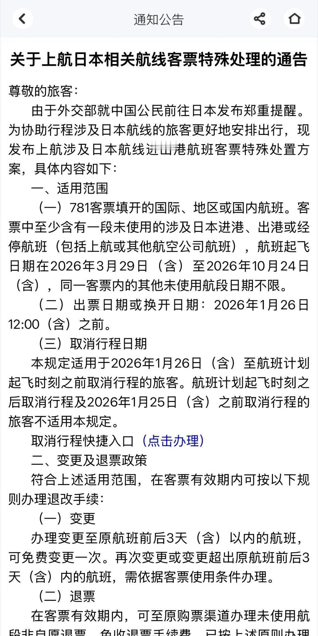 三大航公布涉及日本航线的免费退改政策,今年夏秋依旧是保持这一政策。 估计减航和临时取消航班,依旧会是常态。 大熊猫晓晓和蕾蕾马上要启程回国了,日本境内也没有大熊猫了。 中日关系也是真的到了近些年的历史冰点了,高市真的是打的一手『好牌』。