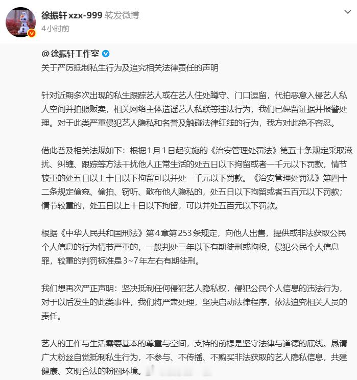 徐振轩报警徐振轩方抵制私生 发“关于严厉抵制私生行为及追究相关法律责任的声明”,