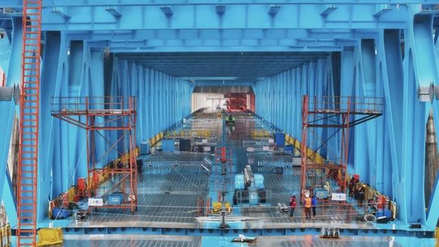 崇启公铁长江大桥主通航孔桥为双塔双索面钢桁结合梁斜拉桥,主跨400米,钢桁梁总长992米,总重量约3.6万吨,采取边跨拖拉、中跨单悬臂架设的施工方案,主通航孔桥共需架设13个节段钢梁,其中自4号墩向3号墩单悬臂架设6个节段。单个钢梁节间长为12.5米,最重节段为918.4吨。架设工期为5个月,预计到今年5月实现合龙。首节单悬臂钢梁架设完成之后,将进行斜拉索挂设施工。