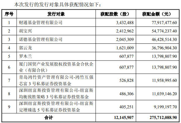 本次发行的发行对象为财通基金管理有限公司、胡宝兴、诺德基金管理有限公司、郭云龙、罗木兰、厦门国贸产业发展股权投资基金合伙企业(有限合伙)、青岛鸿竹资产管理有限公司-鸿竹互强芯富3号私募证券投资基金、深圳纽富斯投资管理有限公司-纽富斯均衡致胜策略3号私募证券投资基金和深圳纽富斯投资管理有限公司-纽富斯定增臻选5号私募证券投资基金。本次发行的所有发行对象均以人民币现金方式并以同一价格认购公司本次发行的股票。上述发行对象在本次发行前后与公司均不存在关联关系。