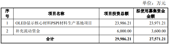 奥来德2026年1月21日披露的2025年度以简易程序向特定对象发行股票募集说明书显示,本次以简易程序向特定对象发行股票拟募集资金总额不超过27,571.21万元(含本数),不超过人民币3亿元且不超过最近一年末净资产的20%,扣除发行费用后的募集资金净额将用于投入以下项目:OLED显示核心材料PSPI材料生产基地项目和补充流动资金。