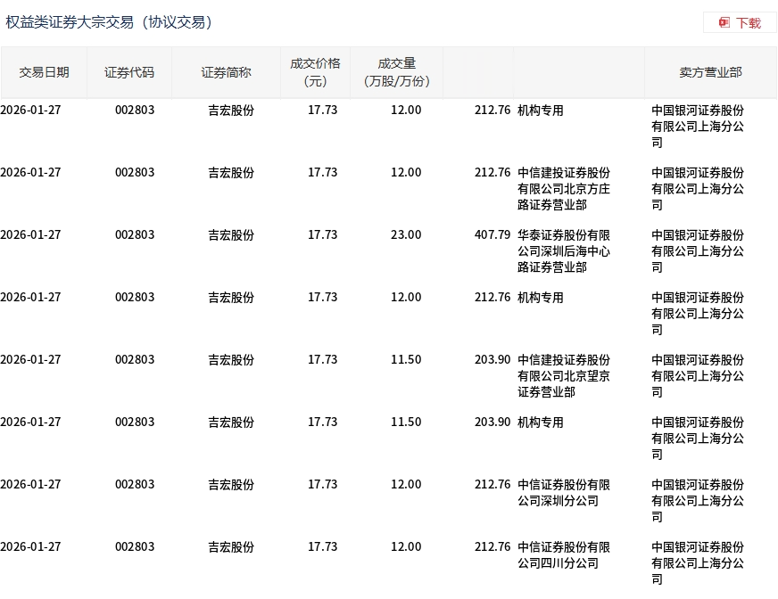 1月27日,吉宏股份大宗交易成交106万股,成交额1879.39万元,占当日总成交额的5.62%,成交价17.73元,较市场收盘价20.15元折价12.01%。