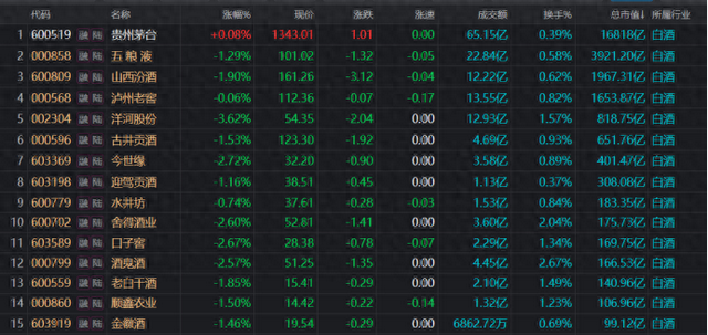 财联社1月27日讯(编辑梓隆),今日(1月27日),白酒板块再度走低,截至收盘,20只成分股中仅贵州茅台微弱收涨。其余个股方面,板块权重股洋河股份跌近3.6%,五粮液、山西汾酒、古井贡酒、今世缘、迎驾贡酒等股也跌幅超1%。
