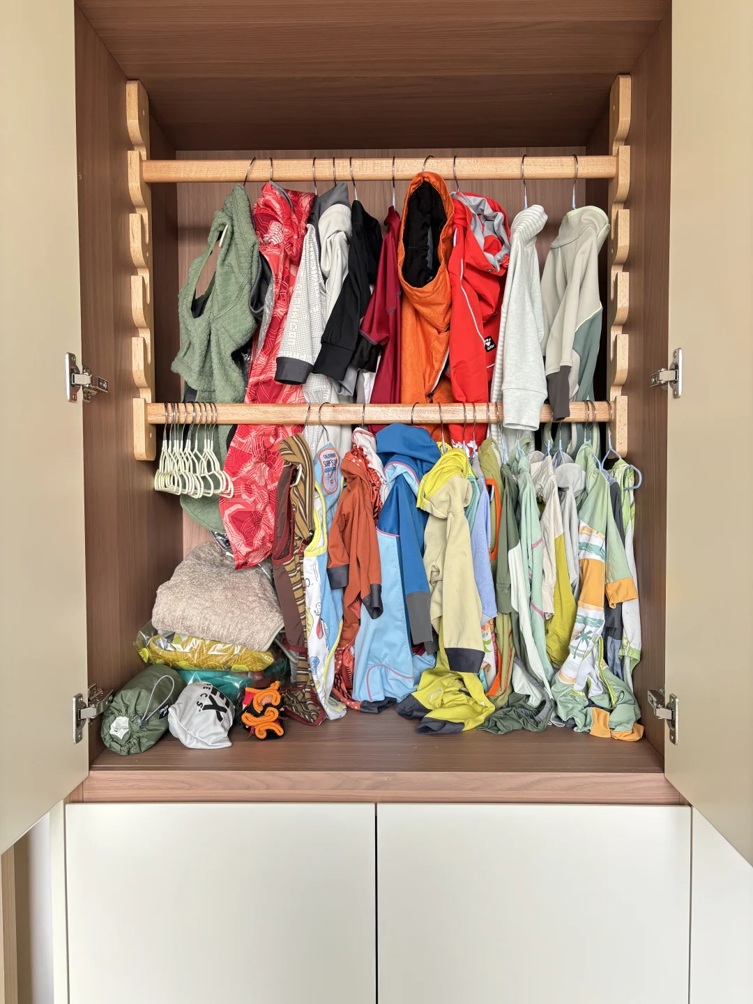 -金属挂杆是自己加的 我们胸背数量不多 最常用的挂在这里就行 挂胸背的衣架是挂帽子的 很方便拿取 回家就挂好