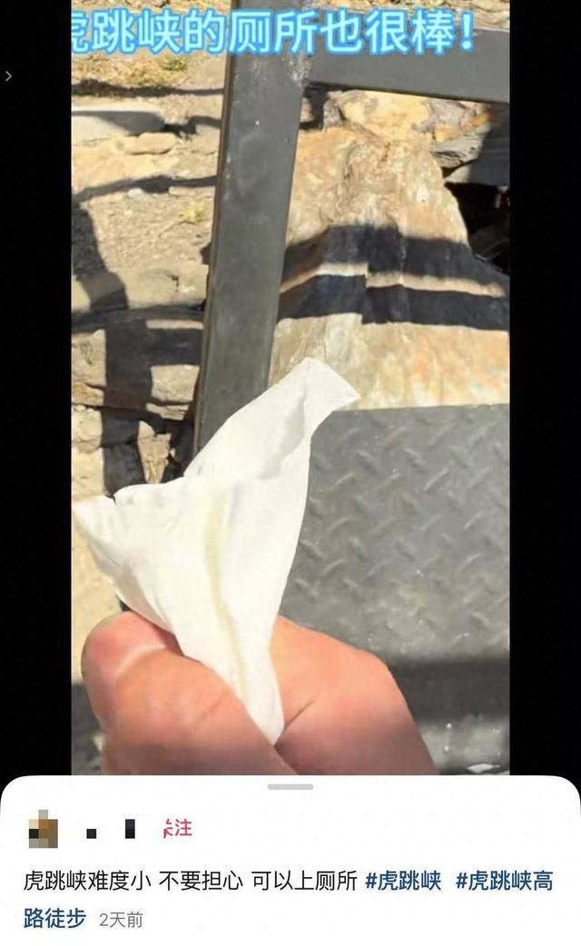 “虎跳峡难度小,不用担心,可以上厕所……”近日,一段记录云南香格里拉虎跳峡徒步路线上“露天厕所”的视频在网络走红。视频中,该网友手持厕纸,镜头环绕展示了这处“硬核厕所”:仅有几根钢架搭起基础框架,没有其他遮挡物,周边还有不少游客路过,画面自带诙谐感。