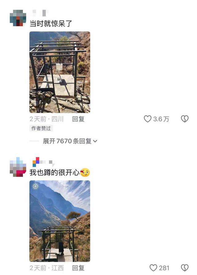 视频评论区中,不少网友晒出照片,称此前在虎跳峡游玩时也曾在该处打卡,并表示“当时就惊呆了”,还有网友调侃:“记住了,到时候去我会带个布帘遮挡一下”“就没有体面一点的卫生间吗”。