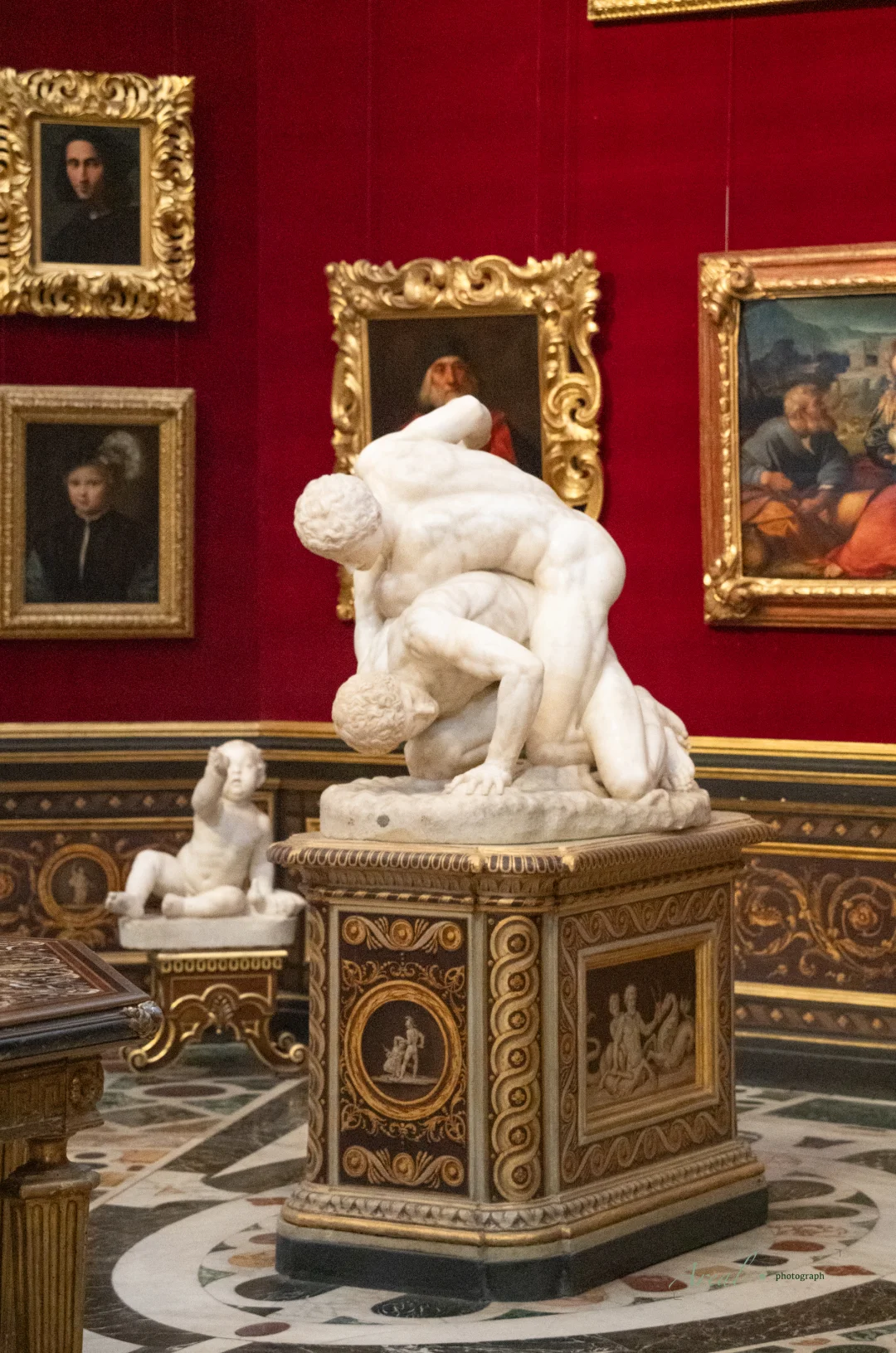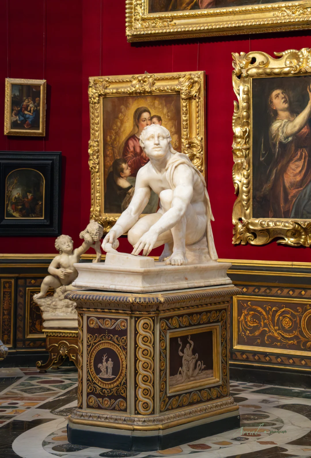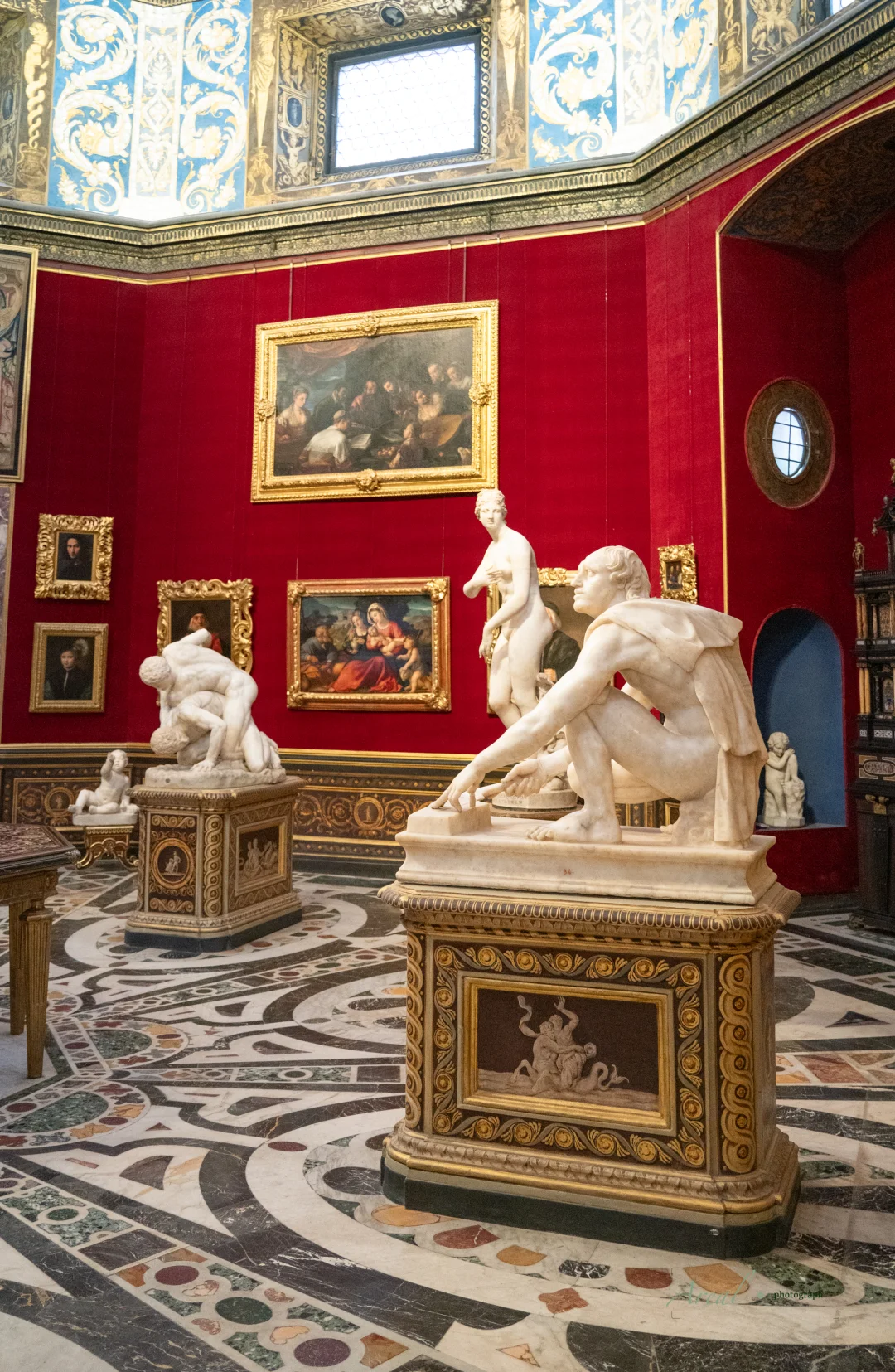 乌菲兹美术馆二楼Tribuna八角厅, 陈列美第奇家族的核心藏品。 这个厅只能在外面远距离欣赏,且需要有序排队。 八边形的设计象征接近天堂,圆顶代表天堂~ 内部用珍珠贝母和黄金组合,墙壁以红色天鹅绒包裹,奢华之极。 这里被称为乌菲兹美术馆的“心脏”, 象征着美第奇家族的财富与权利, 所以,怎么逛知道了吧❓❗️ 来到美术馆内,第一站先冲这里,如果没人就能多看一会儿,真的研究挪不开。从室内设计、到装潢、藏品,每个细节都超级吸睛。 我好奇的是,藏品的总价值~ 谁能告诉我