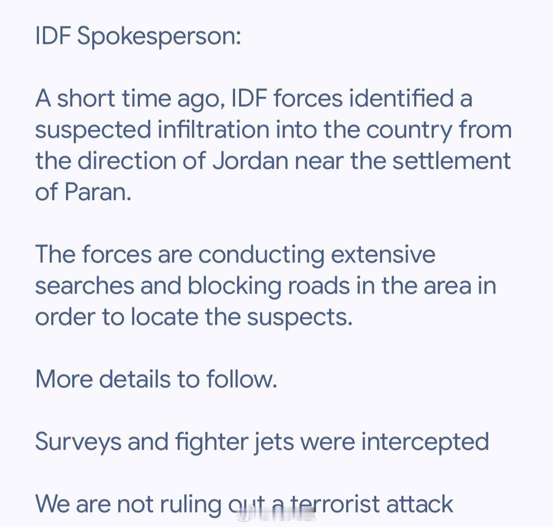 大量身份不明的武装人员已进入位于以色列与约旦边境的帕拉恩定居点,且能听到枪声。据以色列媒体报道,以色列的战斗机、无人机和特种部队已迅速赶往边境渗透事件发生地。海外新鲜事何天恩