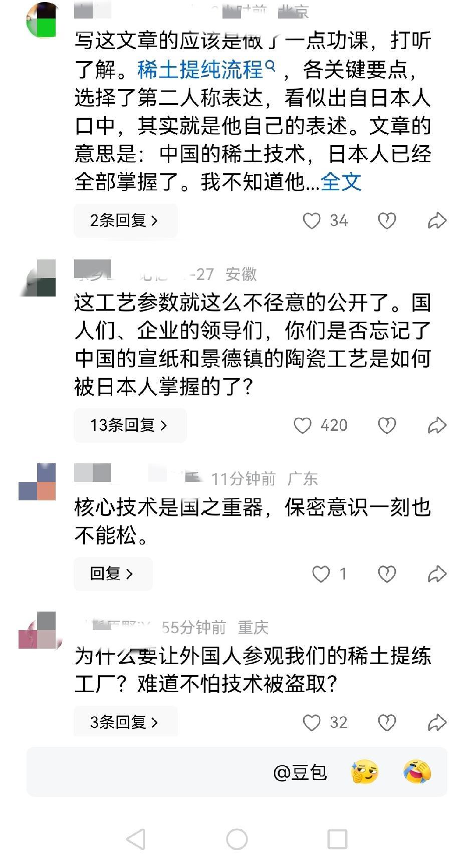 日本大佬看完中国稀土车间,直接社媒“跪”了:这还怎么玩? 23.5℃,多0.1℃都算输!日本技术员松本健一盯着恒温墙,心里咯噔:我们差的不止一条线。 班长瞄一眼观察孔,喊停加料;化验单回来,酸度真超标。松本当场社死:这操作是“人肉AI”? 他回忆日本国宝级实验,釜温飘0.3℃,2亿日元打水漂;中国老师傅却当日常,差距肉眼可见。 再看海底挖矿,日本媒体吹了五年;松本掐指一算:6000米捞泥、海上建厂,预算先翻十倍,直接劝退。 芒廷帕斯矿复产N年,精矿仍运中国回炉;美国老铁默默交学费,全球90%分离产能锁死在华。 建同样万吨线,西方砸30亿美元+8年,中国10亿美元+2年搞定,工人还随喊随到,成本碾压到没朋友。 松本回酒店发长文:重建这套链,20年+万亿美元,成功率看天;政客喊脱钩,技术宅先怂。 配图高清到连搅拌桨秒数都看见,网友急呼:保密呢?know-how一秒泄露,对手省掉试错的钱。 业内提醒:物理分离、生物萃取,美日实验室已加班;开门迎客可以,核心参数得打码。 稀土这张王牌,矿只是入场券,整条产业链才是王炸;松本“跪”得干脆,也给我们提了个醒:优势在手,别浪。 网友评论:写这文章的应该是做了一点功课,打听了解。稀土提纯流程,各关键要点,选择了第二人称表达,看似出自日本人口中,其实就是他自己的表述。文章的意思是:中国的稀土技术,日本人已经全部掌握了。我不知道他描述的是不是真实情况,如果是;国家应该对此人关注。隐秘战线的敌人,无处不在,反谍反特不能松懈,国家安全无小事。 这工艺参数就这么不径意的公开了。国人们、企业的领导们,你们是否忘记了中国的宣纸和景德镇的陶瓷工艺是如何被日本人掌握的了? 小编结语 一场参观,把“中国稀土为什么硬”拍成了现场教学片。工人师傅的“肌肉记忆”、恒温车间的“强迫症”、全产业链的“开挂”,让外国技术大牛直接认输。实力摆在桌面,但保密这根弦也得绷紧;毕竟,下一轮的科技弯道,对手正踩足油门。守住know-how,才能继续把稀土这张王牌,打成王炸。