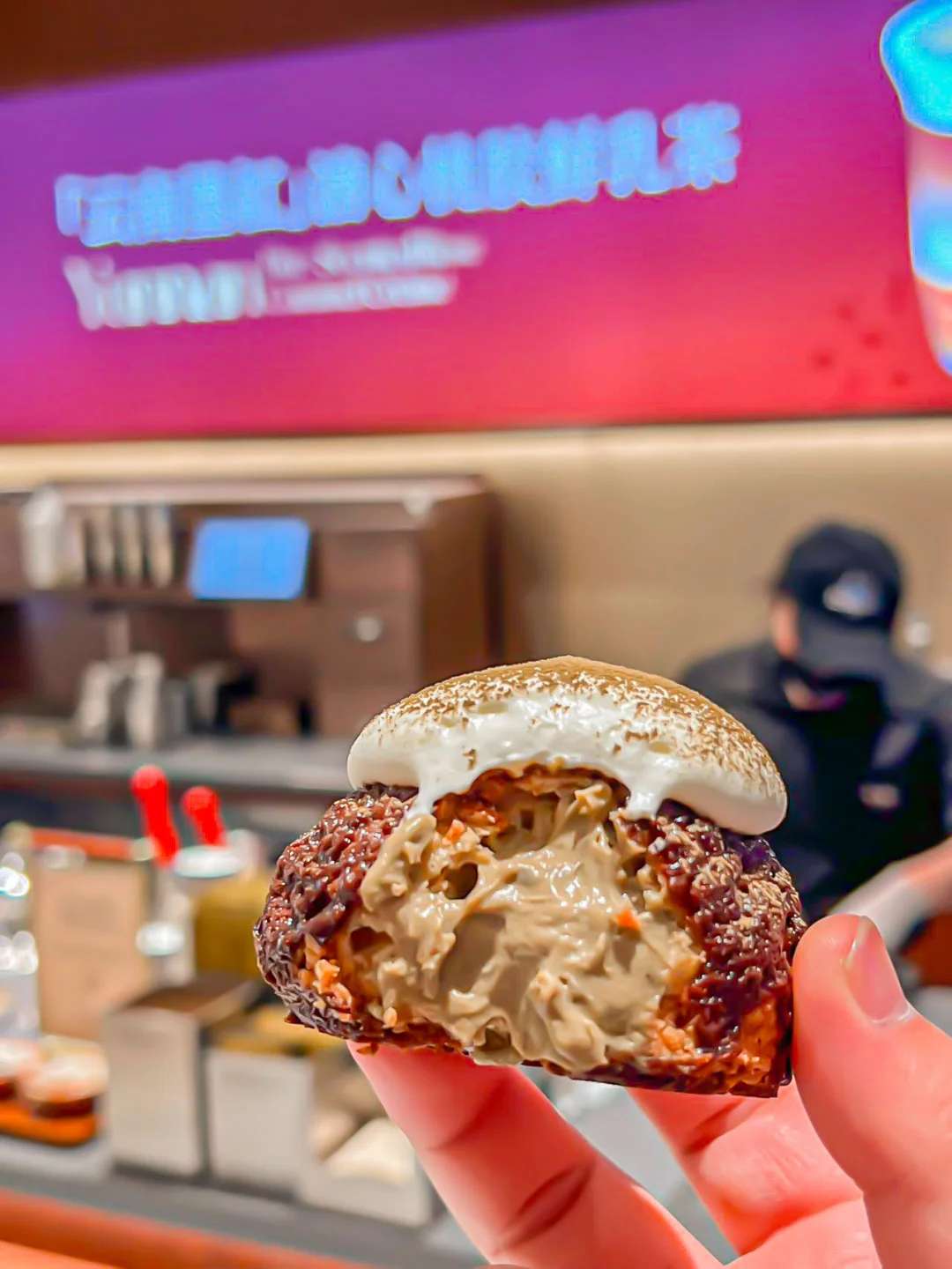 内馅是浓郁焙茶酱,顶上裹着糯糯奶麻薯,微苦回甘超解腻,吃多少都不腻!
