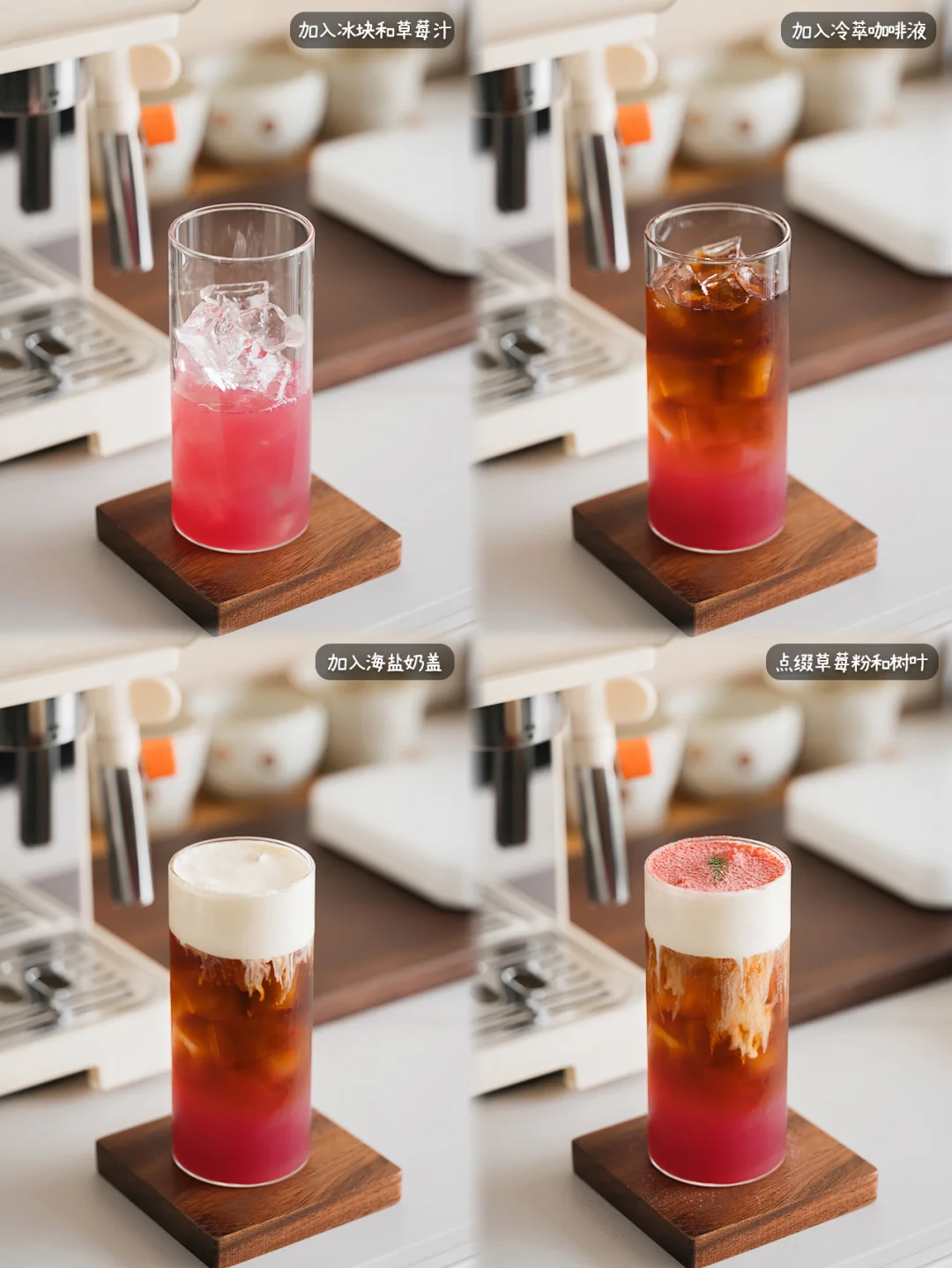 ❷加入冷萃咖啡和奶盖,点缀草莓粉和叶子