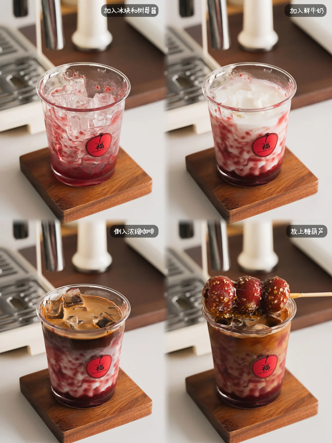 ❷加入牛奶和浓缩咖啡,放上糖葫芦