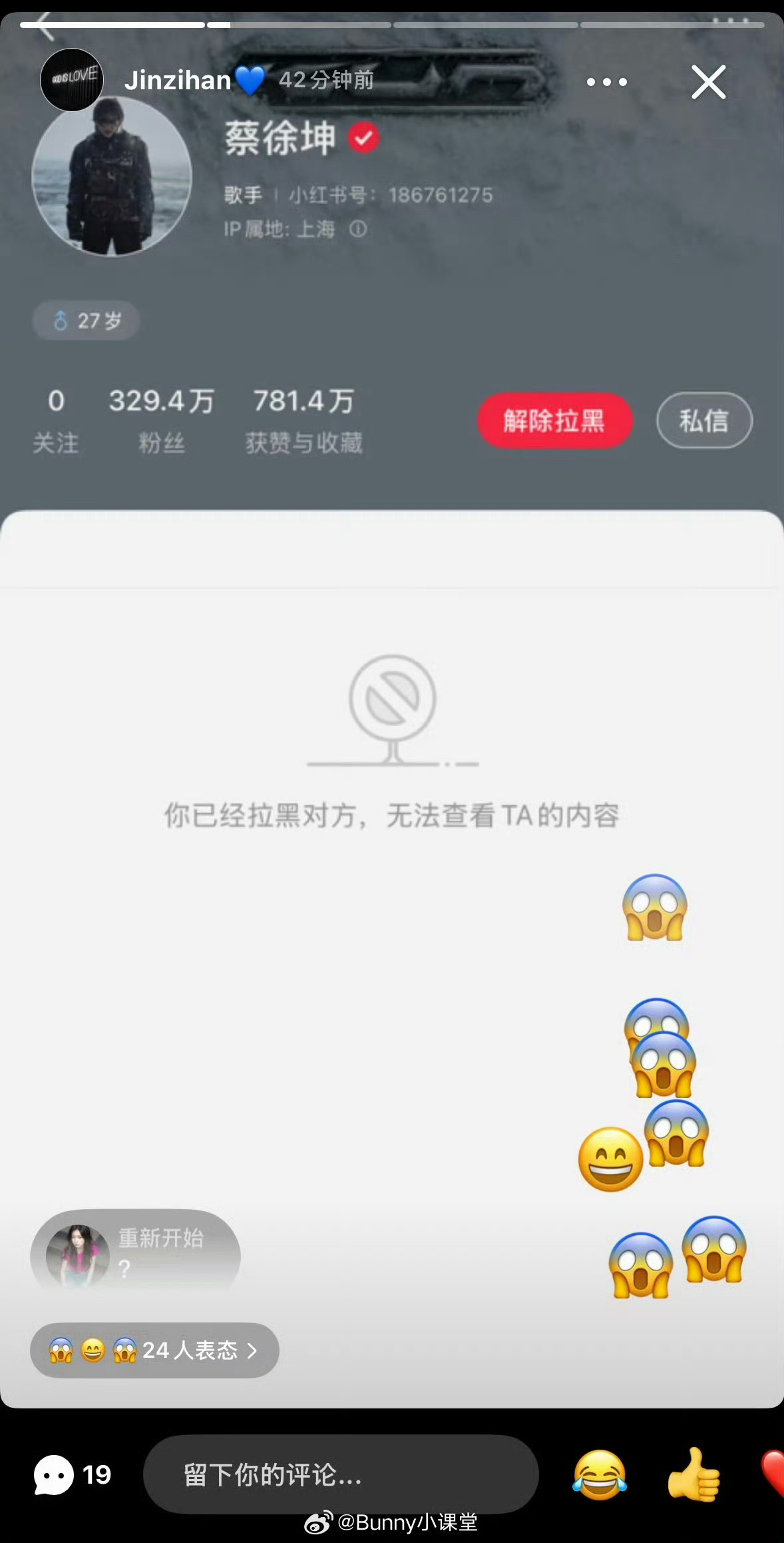 金子涵拉黑蔡徐坤为什么啊感觉后面都没什么交集了又发文案又是竖中指的两个人之间到底