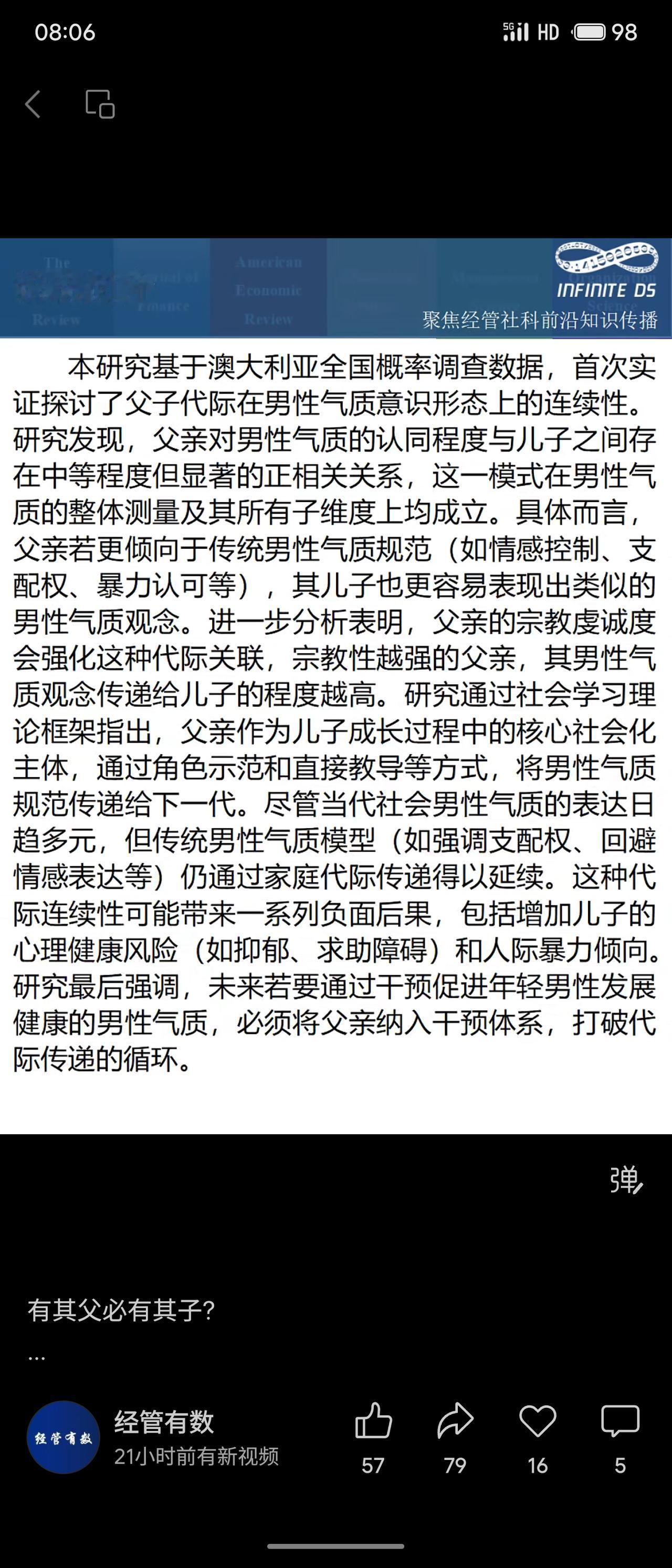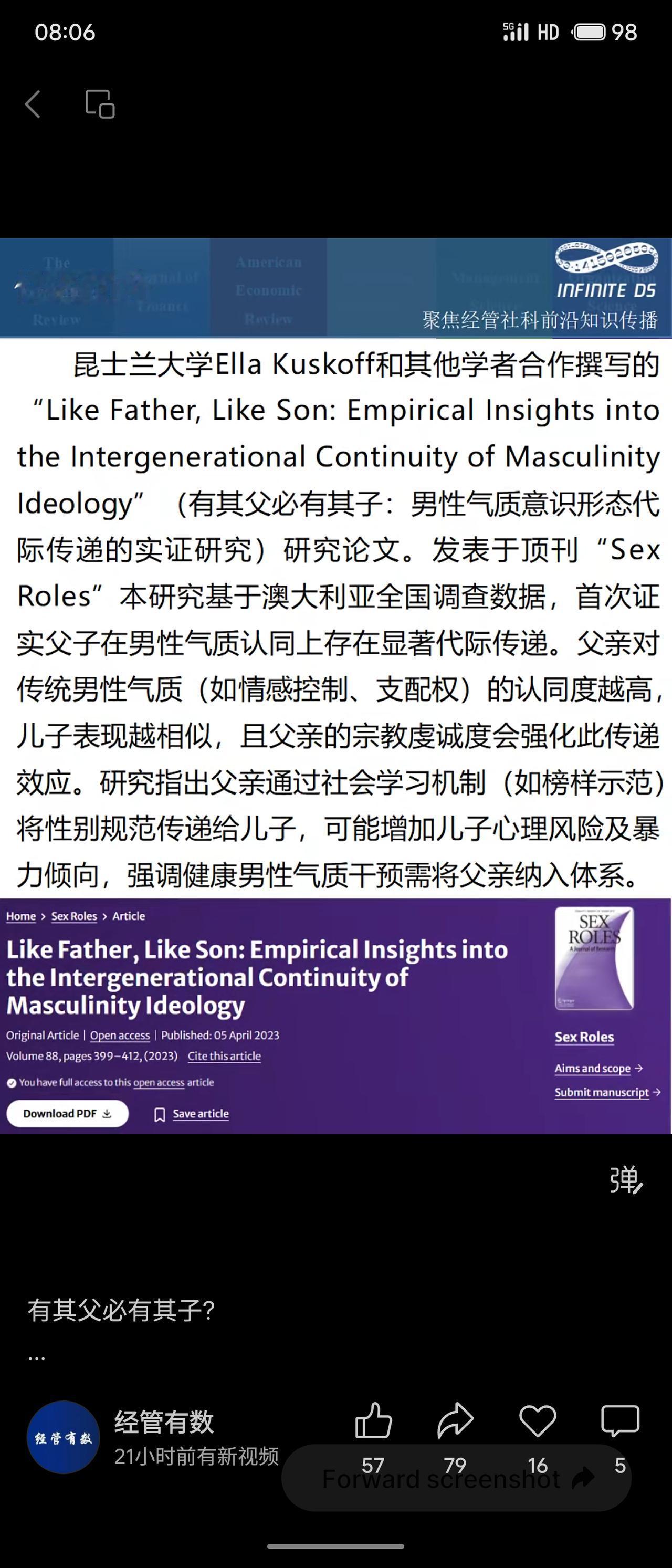 一项基于澳大利亚全国数据的研究,首次实证证实了传统男性气质的代际传递:父亲对支配权、情感控制等观念的认同度越高,儿子越相似。父亲的宗教虔诚度会强化这一传递。研究指出,父亲通过社会学习机制成为儿子的榜样,这可能增加儿子的心理风险与暴力倾向。结论强调,任何旨在塑造健康男性气质的干预措施,都必须将父亲纳入体系,以打破这种代际循环。