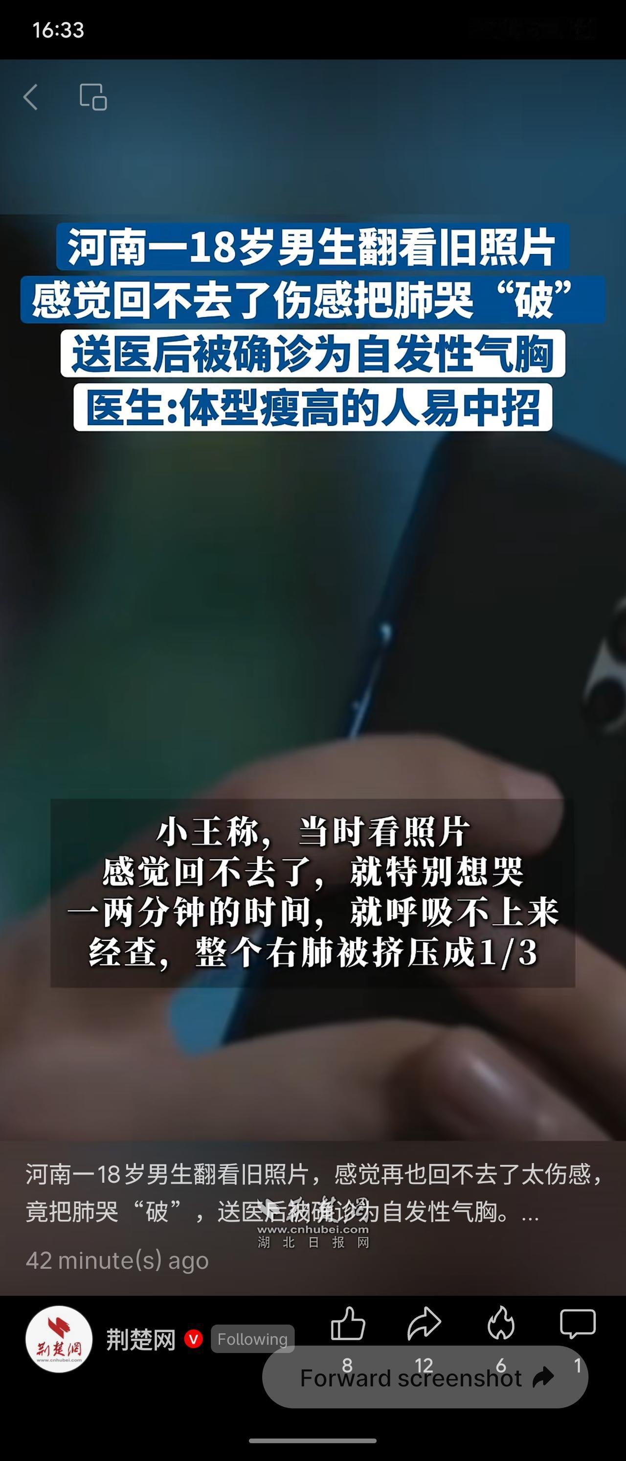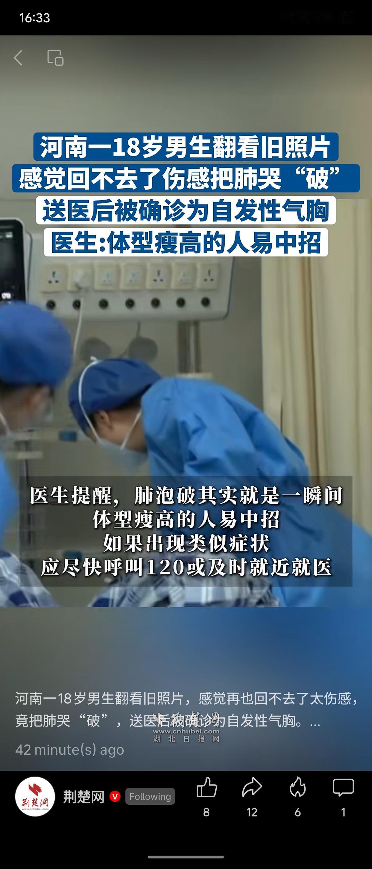河南郑州一名18岁瘦高男生因翻看旧照情绪激动大哭,诱发自发性气胸,右肺被压缩至仅剩1/3。医生提醒,体型瘦高者肺泡壁相对薄弱,剧烈咳嗽、用力或情绪大幅波动时易导致肺泡破裂,若突发胸痛、呼吸困难应立即就医。