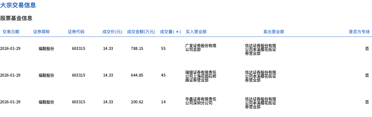 1月29日,福鞍股份大宗交易成交114万股,成交额1633.62万元,占当日总成交额的7.08%,成交价14.33元,较市场收盘价15.85元折价9.59%。