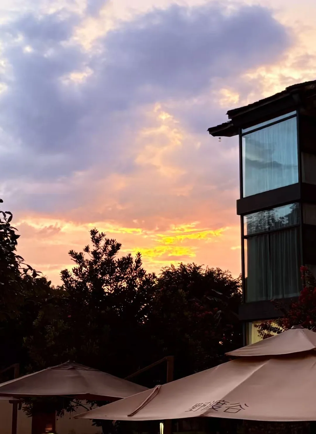 枝桠上挂着的指示牌,风吹日晒,字迹斑斑。 它不说话,却指给了我最想去的方向——“此处,心安。” 抵达时,日光正斜斜地穿过木牌。 箭头指向的不只是一间屋子,更像一种生活状态的邀请: “慢下来”、“看云去”、“等风来”。 晚霞,是天空烧的一壶暖酒 推开门,正好撞见这场盛大的告别式。 远山从青黛浸成橘红,云絮被点燃,又慢慢融进温柔的灰紫里。 我站在露台上,手里握着一杯微凉的白茶,觉得自己也成了这场仪式的一部分。 美,原来是一场寂静的燃烧。 📍广东清远野渡谷民宿