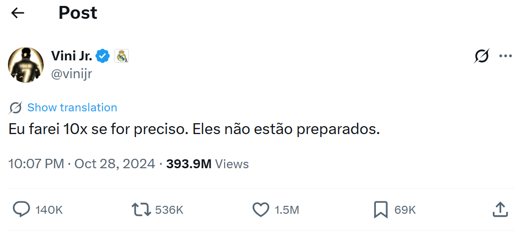 这种现象在最近一场失利后被进一步放大。本周三皇马不敌本菲卡后,这条推文的互动数据迎来暴涨,点赞数攀升至150万,创下新高。同时还累积了约14万条评论和53.5万次转发,成为一条极具话题性的动态。这条原本用于自我激励的推文,反而成了球迷用来调侃和施压的素材。如果接下来的赛季表现仍未明显回暖,这条推文的各项数据,恐怕还会继续被刷新。