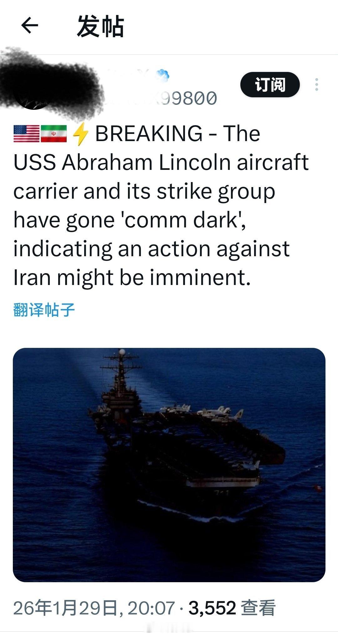 突发消息 - “亚伯拉罕·林肯”号航空母舰及其打击群已进入“全舰熄灯”中断通讯状