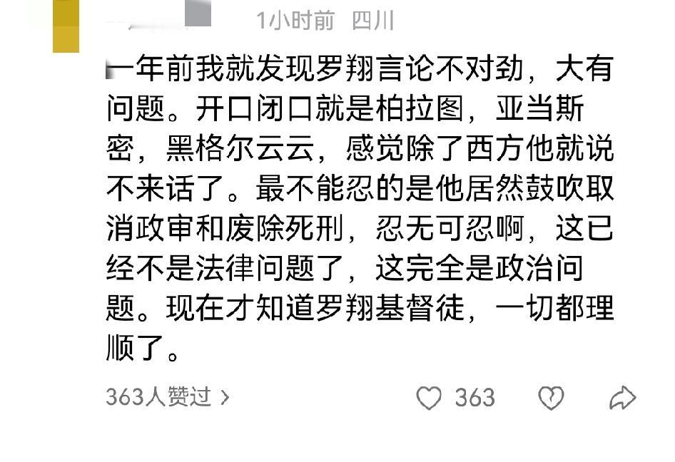 牢A点名“法外张三”!罗翔突然静音,评论区炸出信仰大瓜 牢A一抬手,留子集体松口气:原来今天主菜不是海归,是“法外张三”罗翔。 网友连夜扒旧账:罗翔老师开口柏拉图闭口亚当斯密。是不是也被境外势力拉拢了? 还建议取消政审以及废除死刑,这些“政治问题”让老师,这题超纲了! 牢A补刀:法律是底线,道德是上限,好人反击坏人要是也按杀人算,那条文就成了“保护伞”。 罗翔微博最后一更停在“沉默是金”,粉丝喊话:张三别怕,出来走两步,直播带“经”也行! 牢A一点名,罗翔瞬间静音。网友扒出他“言必称希腊”、鼓吹取消政审+废死刑,还被挖出基督徒身份,直接升咖成“政治问题”。核心争议:法律能不能只当技术条文?好人反击是否也要吃牢饭?一句话,法律是底线,道德得在上,罗翔不回答,评论区替他开庭。牢A 牢a现象