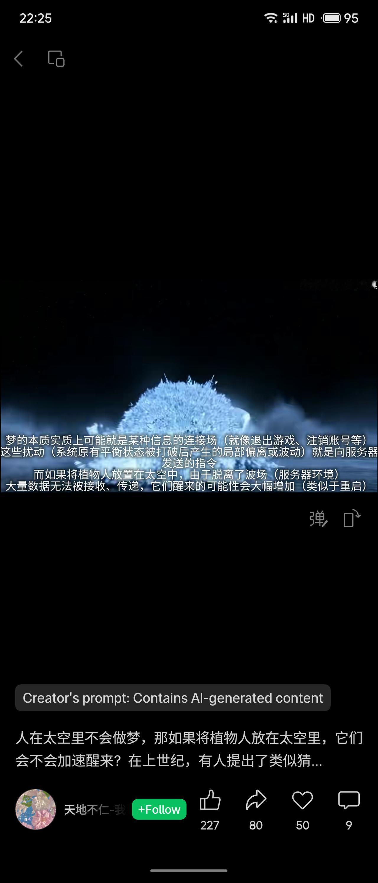 虚构的科幻猜想。其核心逻辑是:宇航员在太空会“消磁”般遗忘且不做梦,由此假设梦境依赖地球的某种“波场”(如服务器)。而植物人的脑波与做梦相似,可能因此“困在”梦境信息场中。若将其置于脱离该场的太空,或能中断无效连接,迫使大脑“重启”而苏醒。分析认为,此猜想用“服务器”、“维度”等比喻构建了一个看似自洽的幻想模型,但缺乏科学依据,其前提与推论均属假设,更多是叙事想象而非实证理论。