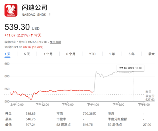 受上述消息影响,闪迪股价周四盘后大涨逾15%。当日常规交易时段,闪迪公司的股价上涨2.2%,收于539.30美元,盘中一度创下546.75美元的纪录新高。