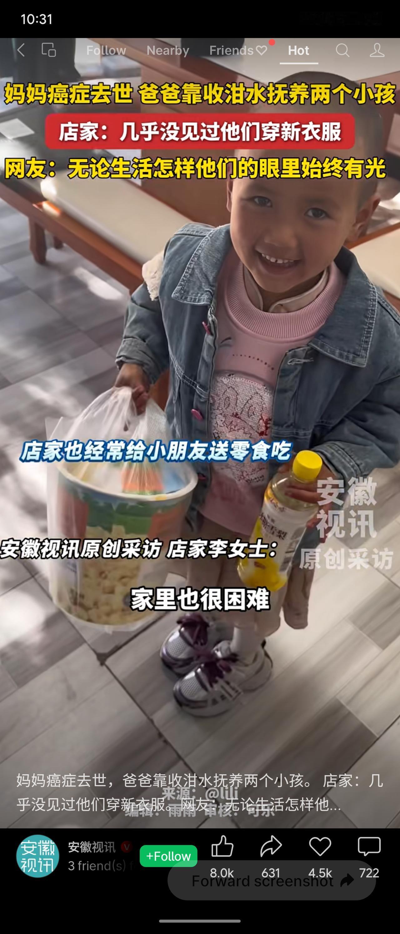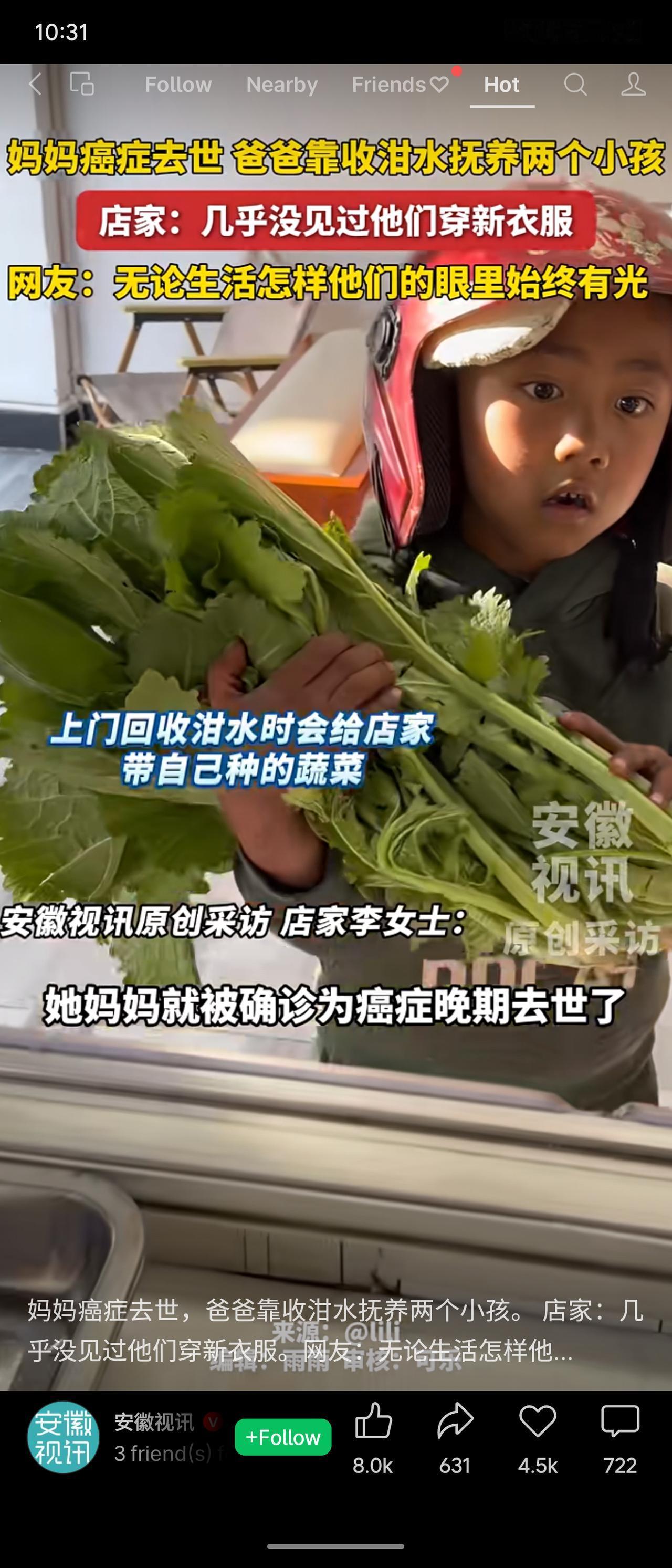 安徽一家庭母亲癌症去世,父亲带病靠收泔水抚养两子。生活拮据,孩子衣着陈旧,但眼中依然有光。他们常送店家自种蔬菜,店家也回赠零食,困境中流动着朴素温情与坚韧。