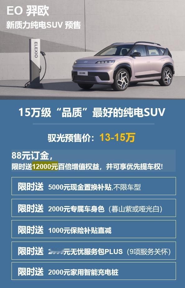 比起到店再说,线上小订金预售爽太多!EO羿欧88元订金就锁12000元权益+优先提车权,预售价13-15万元。权益包括置换补贴、专属车漆、保险补贴、无忧服务包PLUS和家用充电桩,全部信息透明可见。算下来,相当于打八折买到15万级品质最好的纯电SUV,这种可兑现、统一透明的政策真的很少见,真的忍不住安利给大家。