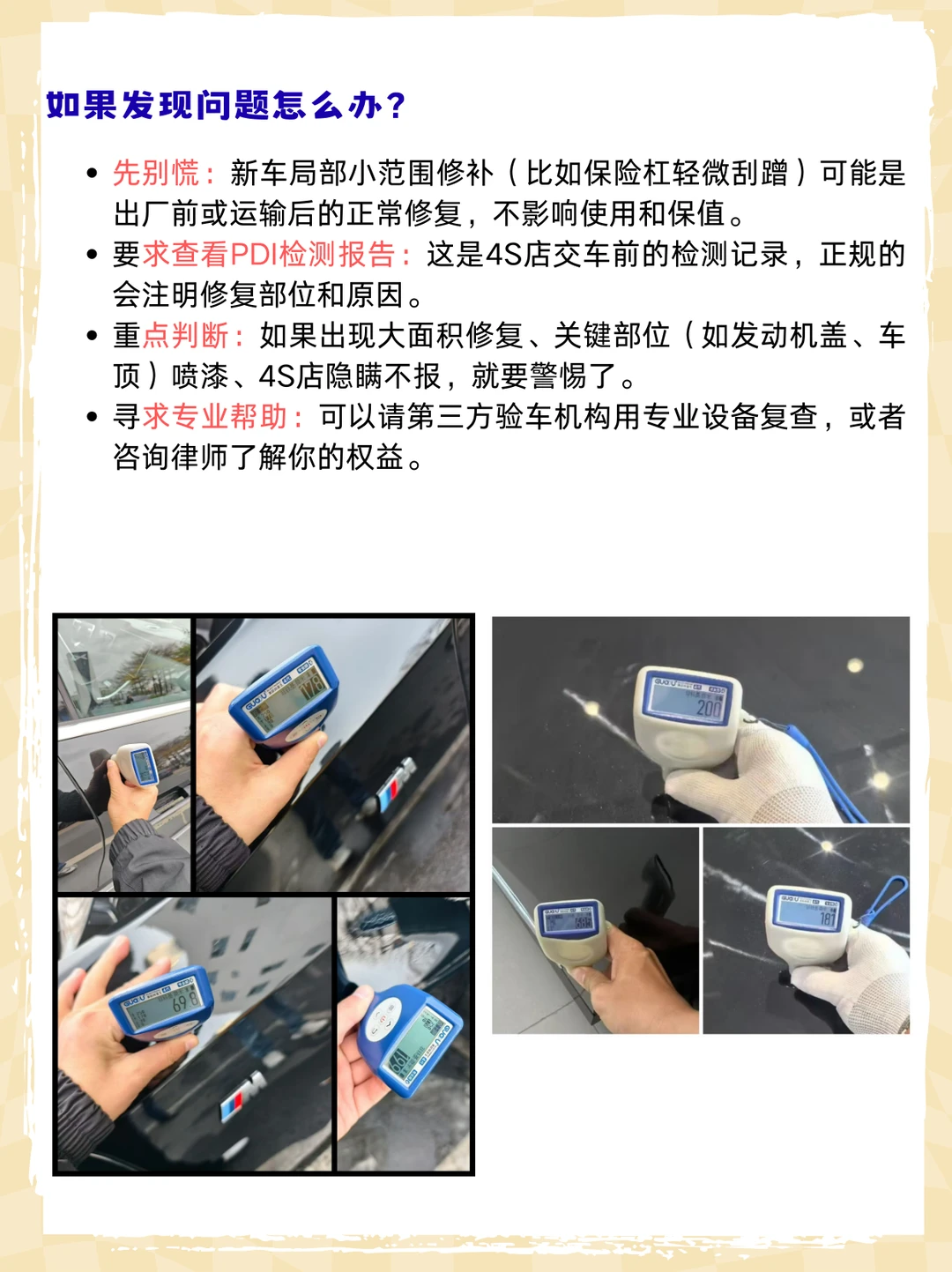 判断新车是否二次喷漆,其实不难,咱们可以自己动手,用“看、摸、听、测”四步法来排查。核心思路是:‌原厂漆面通常均匀一致,而喷漆区域容易出现色差、纹理异常或厚度超标‌。下面我帮你把专业验车技巧拆解成简单几步,照着做就行! 一、快速自检四步法(无需工具) ‌目视检查:看光泽与色差‌ ‌时间‌:选晴天上午10点到下午4点,自然光下最准。 ‌方法‌:绕车走一圈,眼睛和车身保持水平。重点看‌前保险杠、引擎盖、车门边缘‌这些易磕碰的部位。 ‌看什么‌:原厂漆颜色均匀、光泽自然。喷漆处可能有色差(比如一块偏暗或发乌),或者有橘皮纹、流挂痕迹。 ‌触感检查:摸平整度‌ ‌方法‌:洗净双手,从车头到车尾轻抚漆面。 ‌感受‌:原厂漆像婴儿皮肤般细腻光滑。喷漆处可能有颗粒感、粗糙感,或者像砂纸打磨过的细微条纹。‌车门把手内侧、后备箱边缘‌这些角落容易藏瑕疵。 ‌听音检查:敲击辨真假‌ ‌方法‌:用指节轻敲车身(比如引擎盖、车门)。 ‌声音‌:原厂漆声音清脆均匀。喷漆且刮过腻子的地方,声音会沉闷、发空。 ‌细节检查:盯缝隙与边缘‌ ‌重点看‌:车门、引擎盖、后备箱的密封条周围,以及前后保险杠与车身的连接处。 ‌找什么‌:原厂漆过渡自然。喷漆可能留下‌漆雾、流挂痕迹‌,或者密封条有零星漆点。 二、进阶工具检测(更精准) 如果自检发现可疑,可以用这些工具: ‌漆膜厚度仪‌:最准!原厂漆厚度一般在90-150微米。如果某区域超过200微米甚至300微米,基本可以确定喷过漆。 ‌强光手电筒‌:晚上或光线暗时,用45度角照射漆面,能看清橘皮纹、细微划痕。 ‌色差仪‌:专业设备,测量色差值。如果数值超过1.5,说明颜色有明显差异。 四、如果发现问题怎么办? ‌先别慌‌:新车局部小范围修补(比如保险杠轻微刮蹭)可能是出厂前或运输后的正常修复,不影响使用和保值。 ‌要求查看PDI检测报告‌:这是4S店交车前的检测记录,正规的会注明修复部位和原因。 ‌重点判断‌:如果出现‌大面积修复、关键部位(如发动机盖、车顶)喷漆、4S店隐瞒不报‌,就要警惕了。 ‌寻求专业帮助‌:可以请第三方验车机构用专业设备复查,或者咨询律师了解你的权益。 ‌最后提醒‌:提车时多花半小时仔细检查,能避免后续很多麻烦。如果自检没把握,直接花几百块请专业验车师,比自己瞎猜强多了!
