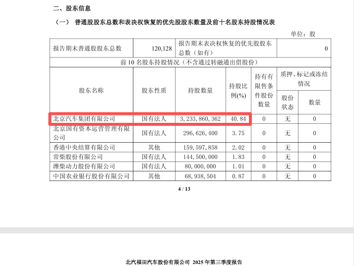 北汽集团是福田汽车的控股股东。截至2025年第三季度末,北汽集团直接持有福田汽车40.84%的股份。