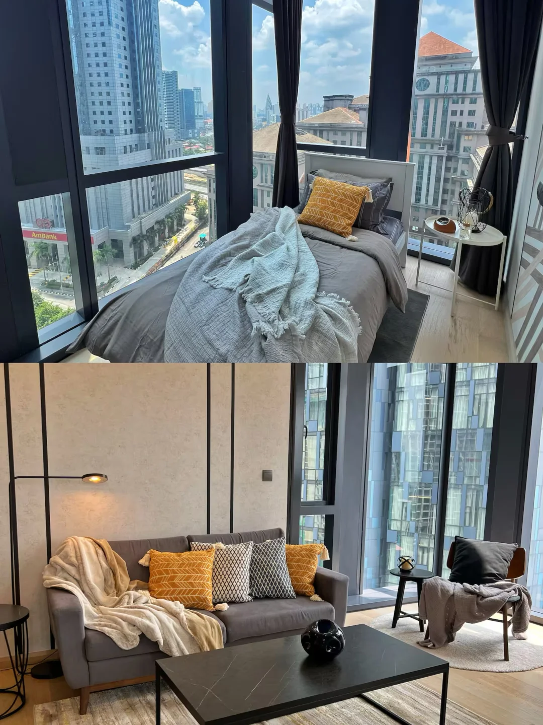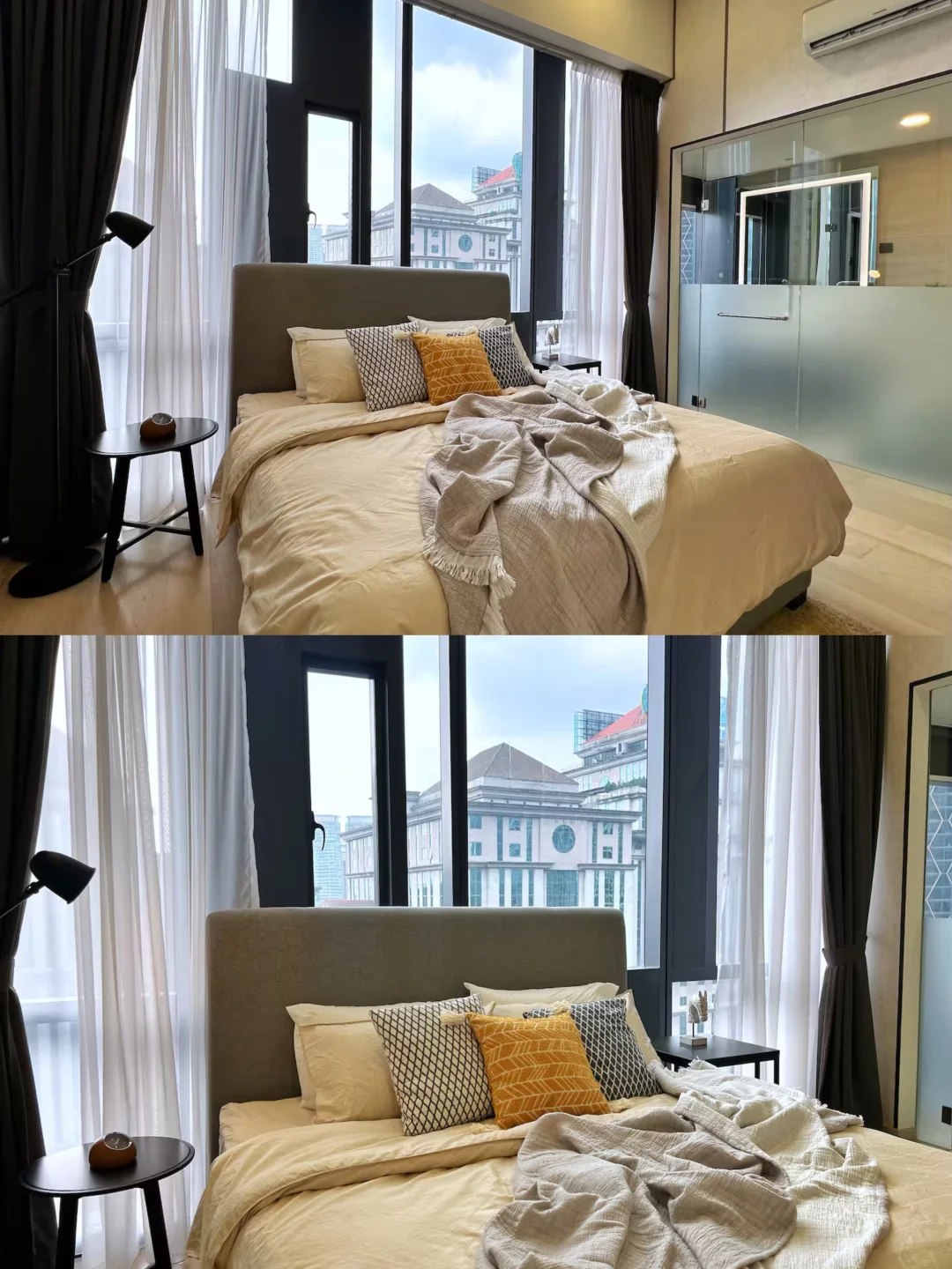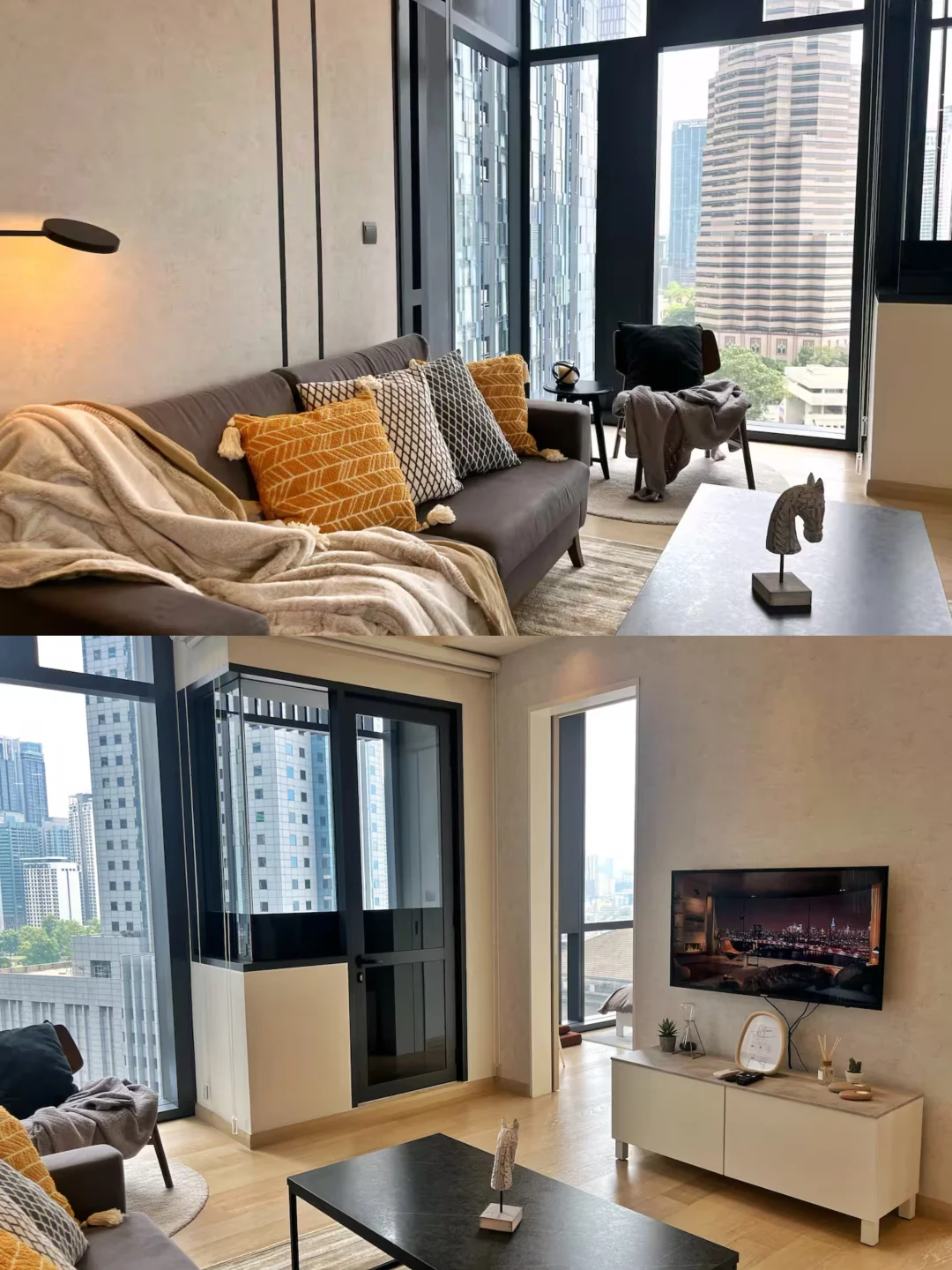 -客厅、卧室都有超大的落地窗户,窗外是林立的摩天大楼🏙️,夜幕降临可以在室内欣赏霓虹闪烁,车水马龙;清晨和傍晚也能感受迷人的阳光