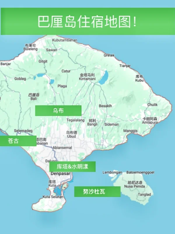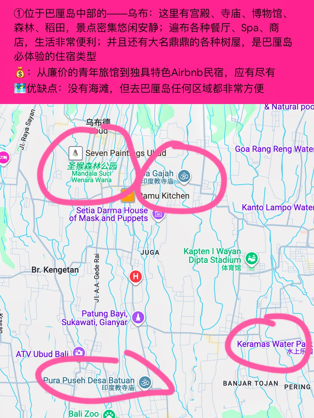 如果你是第1次来巴厘岛,那么我推荐你住在乌布!乌布区域详细介绍和其他3个区域介绍我都放在图片上啦!
