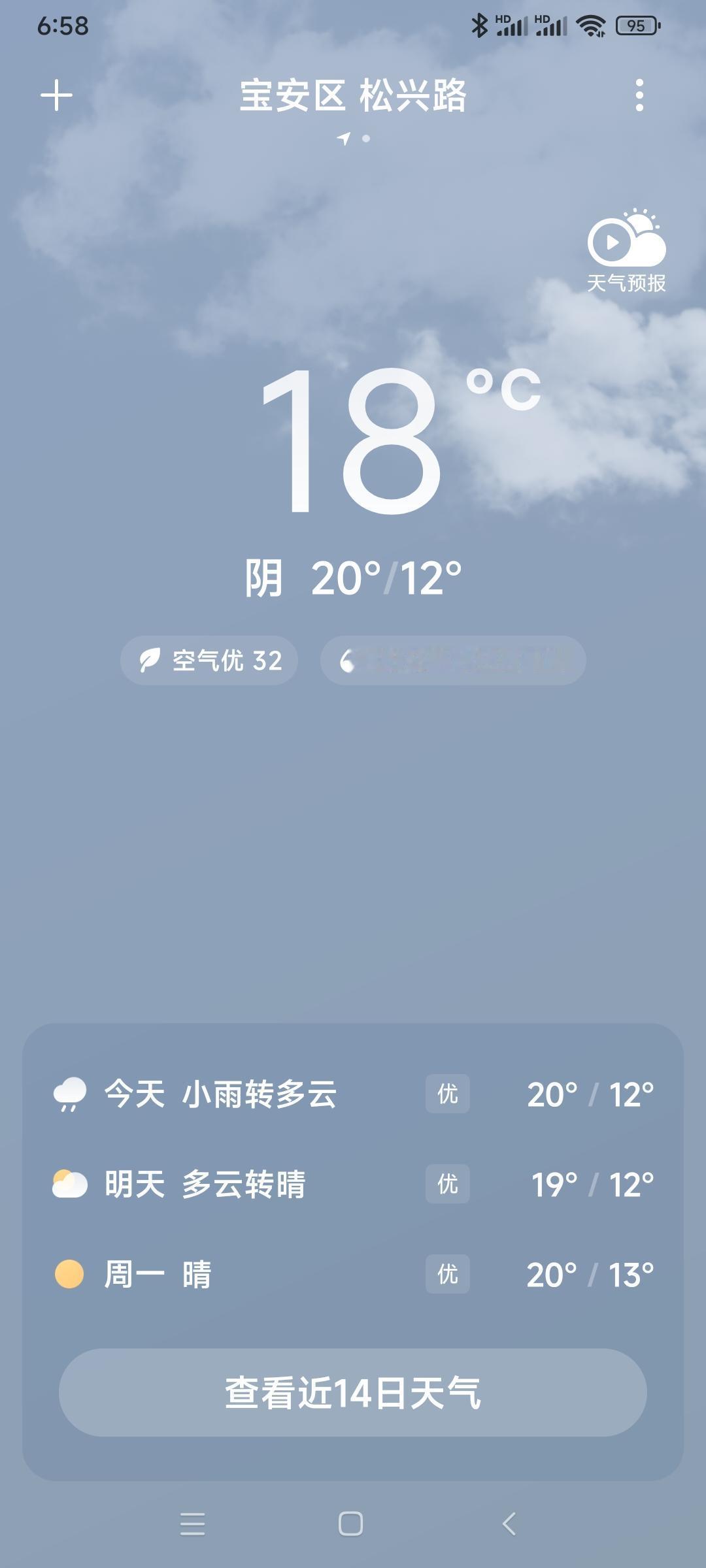 我的今日状态:😁轻松愉快 我这里的天气:🌤️多云!今日深圳小雨转多云,气温12度到20度,湿度81度。大家早上好周末愉快![作揖]