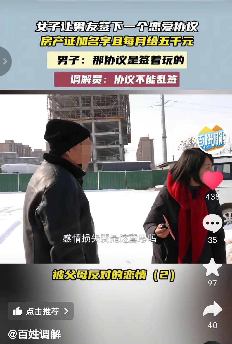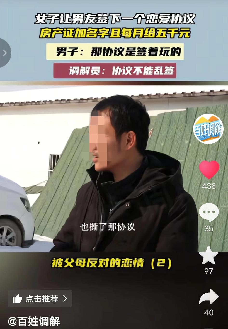 悔到肠子都青了!河南一男子和大11岁的女友相恋遭父母反对,女友住到他家仅一周,就逼他签下一份恋爱协议,要求房产证加名、每月给5000元生活费,男子事后却称“协议是签着玩的”,调解员当场普法! 河南的小李和女友小敏相恋半年多,这段感情从一开始就遭到了小李父母的强烈反对——原来小敏比小李大11岁,而且有稳定的正式工作,小李母亲认为这是“门不当户不对”,更怀疑女方是冲着小李的房子来的,动机不纯! 为了让父母看到两人在一起的决心,小李软磨硬泡,终于说服小敏先搬到家里住,想用行动证明他们是认真的。 谁知道,刚住满一周,小敏就在吃过晚饭后,把一份打印好的《恋爱协议》“啪”地拍在了桌子上。协议上的条款让小李的手都僵住了:不仅要求在他婚前买的房子上加上她的名字,每月还要给她5000元生活费,订婚时得给66000元彩礼,甚至白纸黑字写着“男方必须对女方打不还手、骂不还口”。 “你啥意思?”小李皱着眉问。小敏抱着胳膊,语气带着不容商量的强硬:“我住进来就是奔着结婚的,签这个协议,就是要你给我个保障。”小李看着女友认真的表情,又想起父母对这段感情的态度,怕拒绝了会激化矛盾,就想着先哄她开心,没细琢磨,稀里糊涂地签了字。 可没想到,没几天,小敏就拿着协议,坐在客厅里等他兑现。小李这才慌了,连忙解释:“我就是签着玩的,哪能当真啊!”小敏却不依不饶:“白纸黑字签了名,你想耍赖?” 两人闹到了《百姓调解》的现场。了解后对小李说:“只要是双方自愿签署且内容不违法,这份协议就具备法律效力,不能一句‘签着玩的’就反悔。”小李听完,脸瞬间垮了下来。 - 有网友怒怼:这哪是谈恋爱,分明是签卖身契!住一周就狮子大开口,这女的心思也太明显了 - 有网友吐槽:男的也是活该!这种协议也敢随便签,恋爱脑上头连基本的法律常识都没有了 说白了,这事儿给所有人提了个醒:恋爱可以感性,但涉及到财产和责任的协议必须理性对待。签字前多一分清醒,就少一分后续的麻烦。 换作是你,会签这种恋爱协议吗? 恋爱协议纠纷 房产证加名 婚恋矛盾 民生热点 争议民生 来源:百姓调解 及网络公开内容,如有侵权请联系即删 配图说明:本文配图/视频素材来自@ 百姓调解,仅用于内容分享,侵权联删