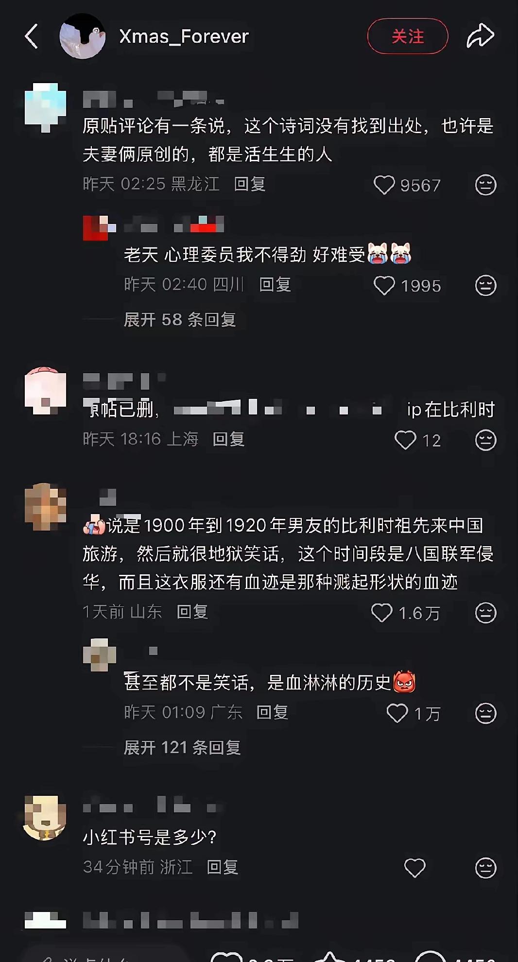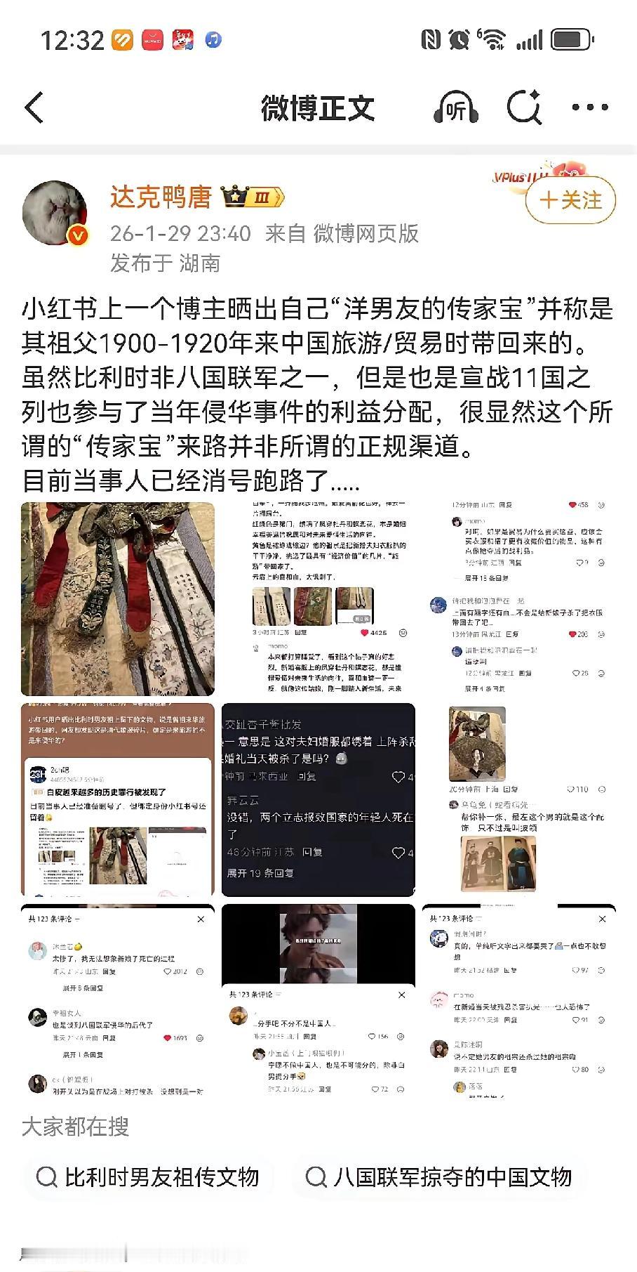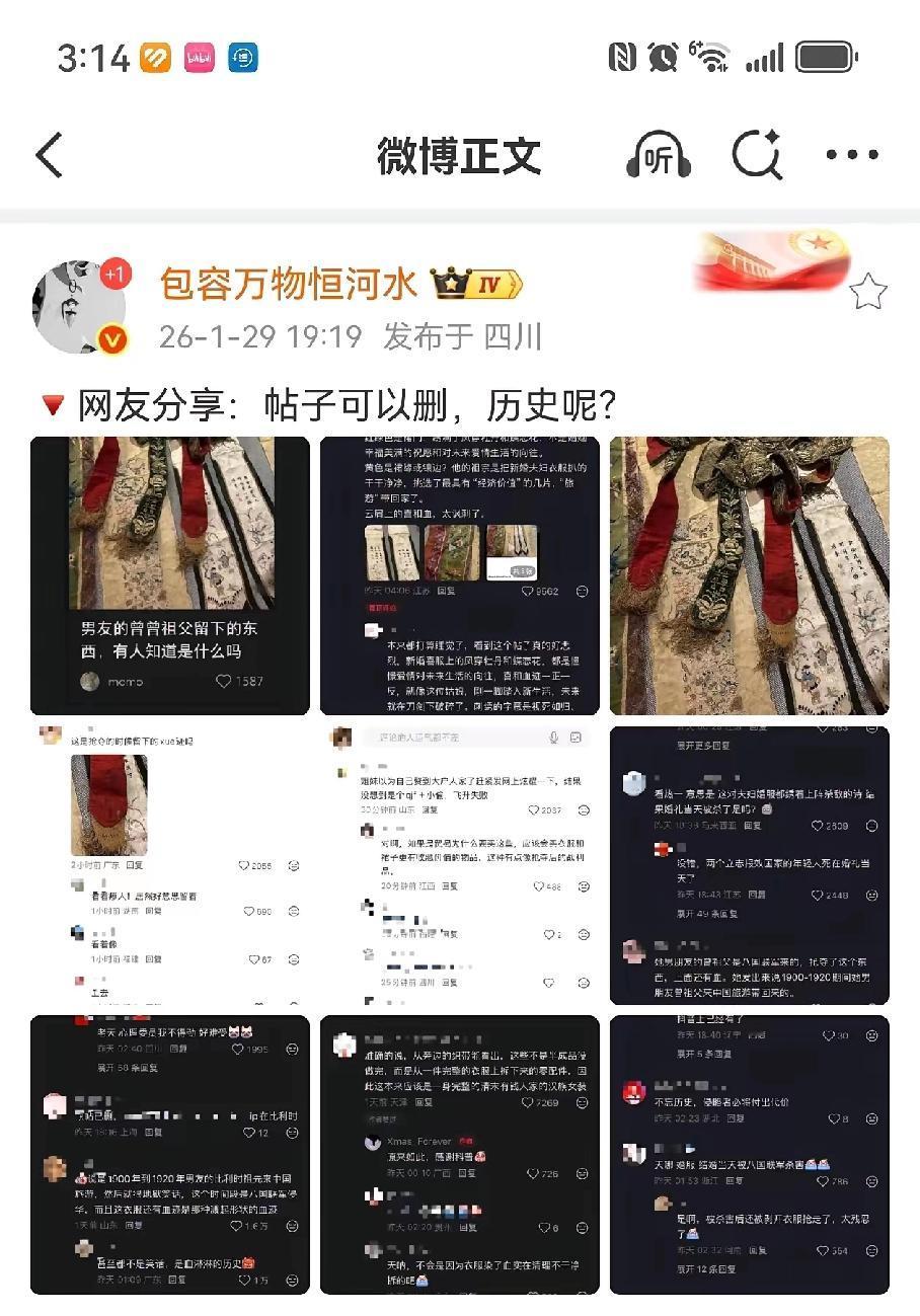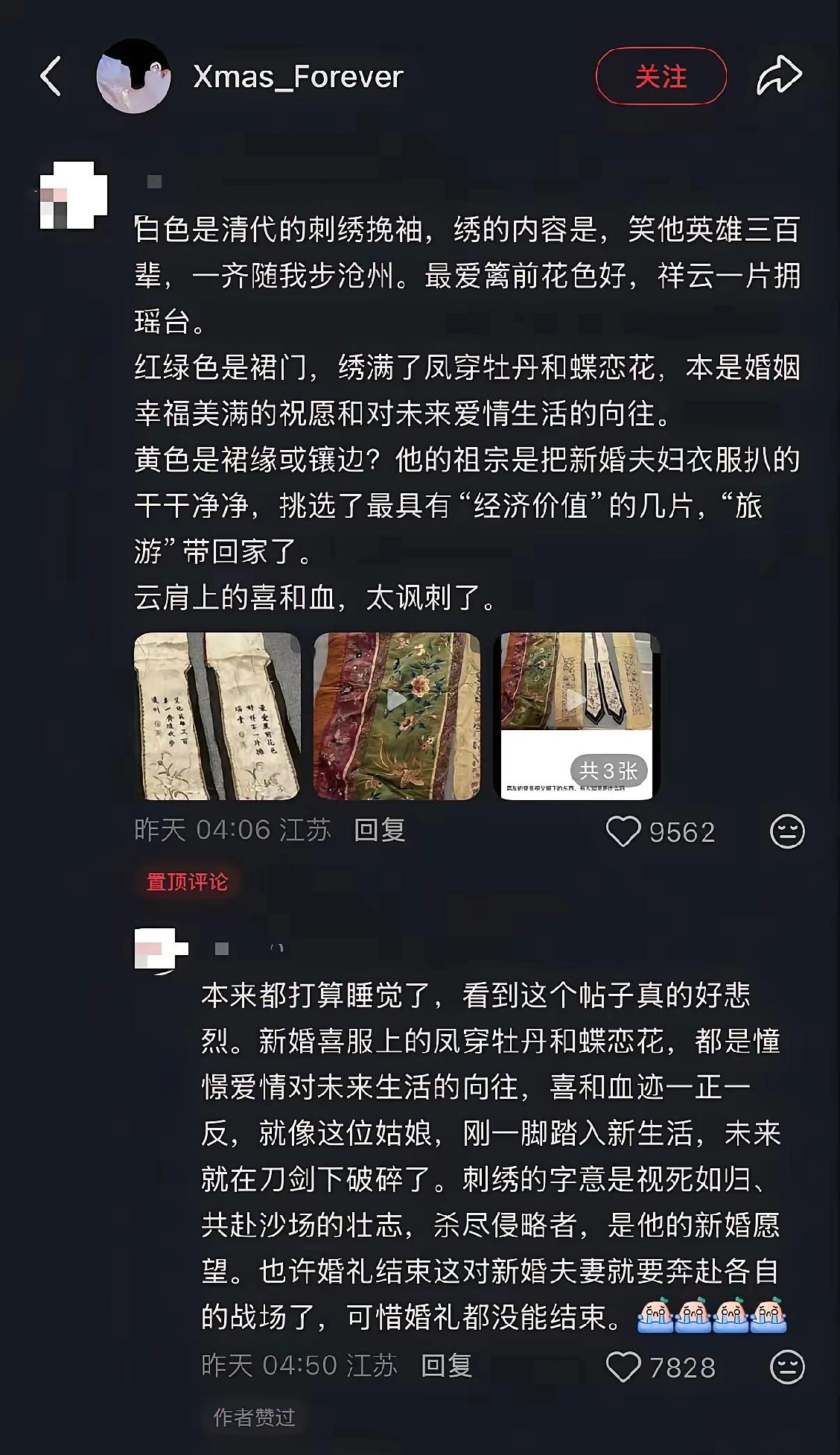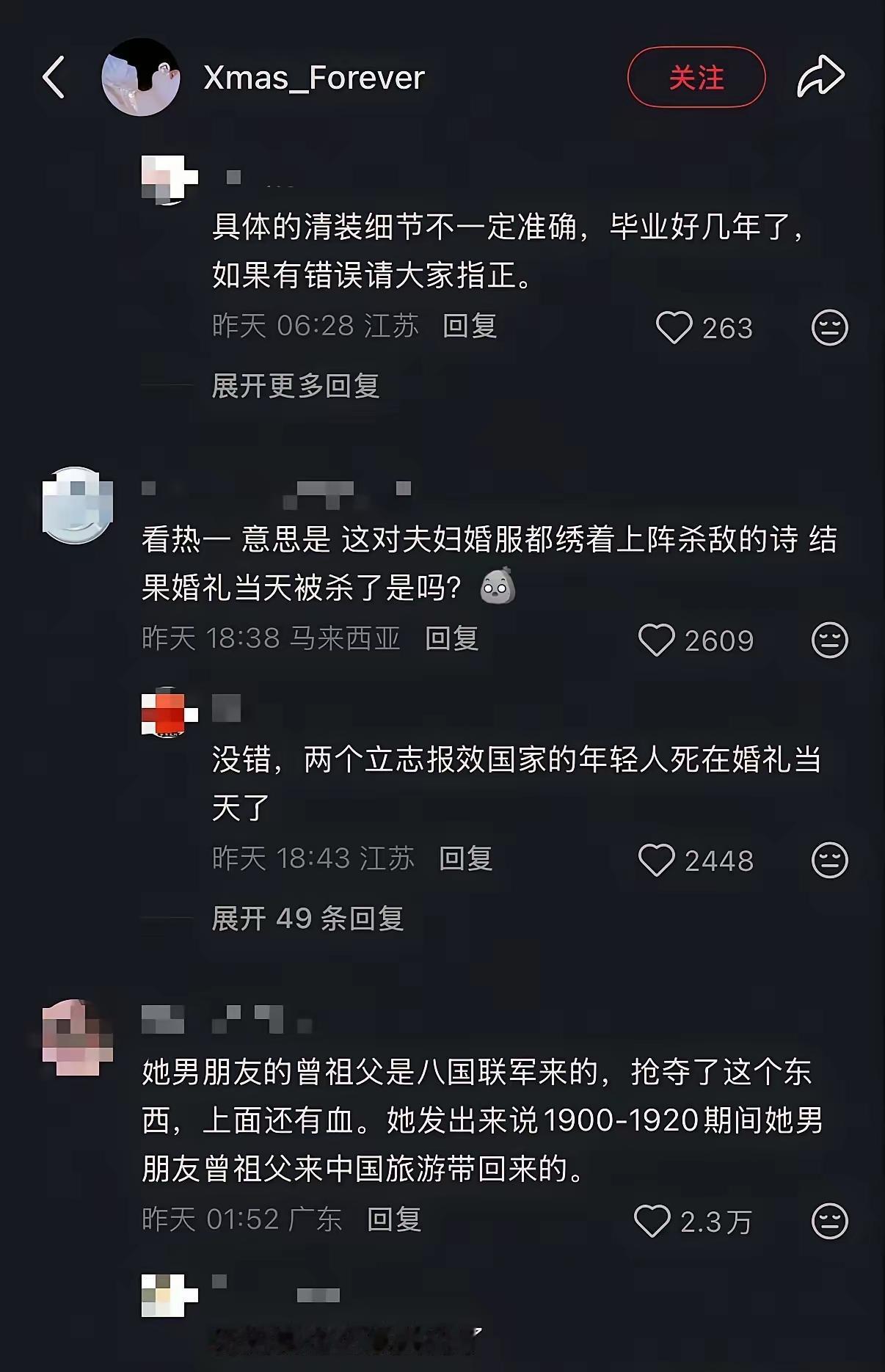 比利时“传家宝”冲上热搜,洋人抢来疑似带着国人血渍的中国嫁衣,还敢秀恩爱? 秀恩爱翻车,比利时华人女友晒“祖传”红嫁衣,配文“曾曾祖父旅游带回”,本想秀浪漫,结果被网友一眼识破:喜字、凤牡丹、血渍、抗敌诗,分明是咱家姑娘的绝命婚服。 1900年的“旅游”?历史课代表上线:庚子年八国联军打进北京,比利时也在列。烧杀抢掠三天三夜,嫁衣上的血迹就是时间表,旅游说法秒变笑话。 挽袖绣着“笑他英雄三百辈,一齐随我步瀛洲”,网友差不多诗句的出处,应是新娘自拟绝笔。绣线还没褪色,满屏的悲伤却溢出来,点燃大家的怒火。 衣角暗纹四爪蟒,清代宗室规格。新娘可能是郡主级别,新婚夜遭毒手,嫁衣被当战利品打包上船。 “把抢来的衣服当传家宝,等于把祖辈的犯罪记录裱起来挂客厅。”热评十万赞,当事人删帖改名,连夜跑路。 据不完全统计,海外中国文物超千万件,嫁衣类不足百件,每一件都是活证据。追索官司打十年,胜诉了执行也难,因为“善意取得”四个字。 铭记不是喊口号,评论区高赞:“虽远必诛是留给子孙的保命符。”记住不是为了报仇,而是为了下次不被抢。落后才挨打,把国货做成硬核,把历史做成免疫力。 看到疑似中国流失文物,先截图保存,再报国家文物局“文物回家”平台,三日内有专人对接。每一次转发,都是给国宝铺回家的路。 一件嫁衣,一首绝命诗,把120年前的苦难递到我们耳边。时刻提醒着我们:遗忘历史被抢更可怕。你遗忘了随时可以重蹈覆辙。只有记住历史,铭记苦难。才能不在被欺负